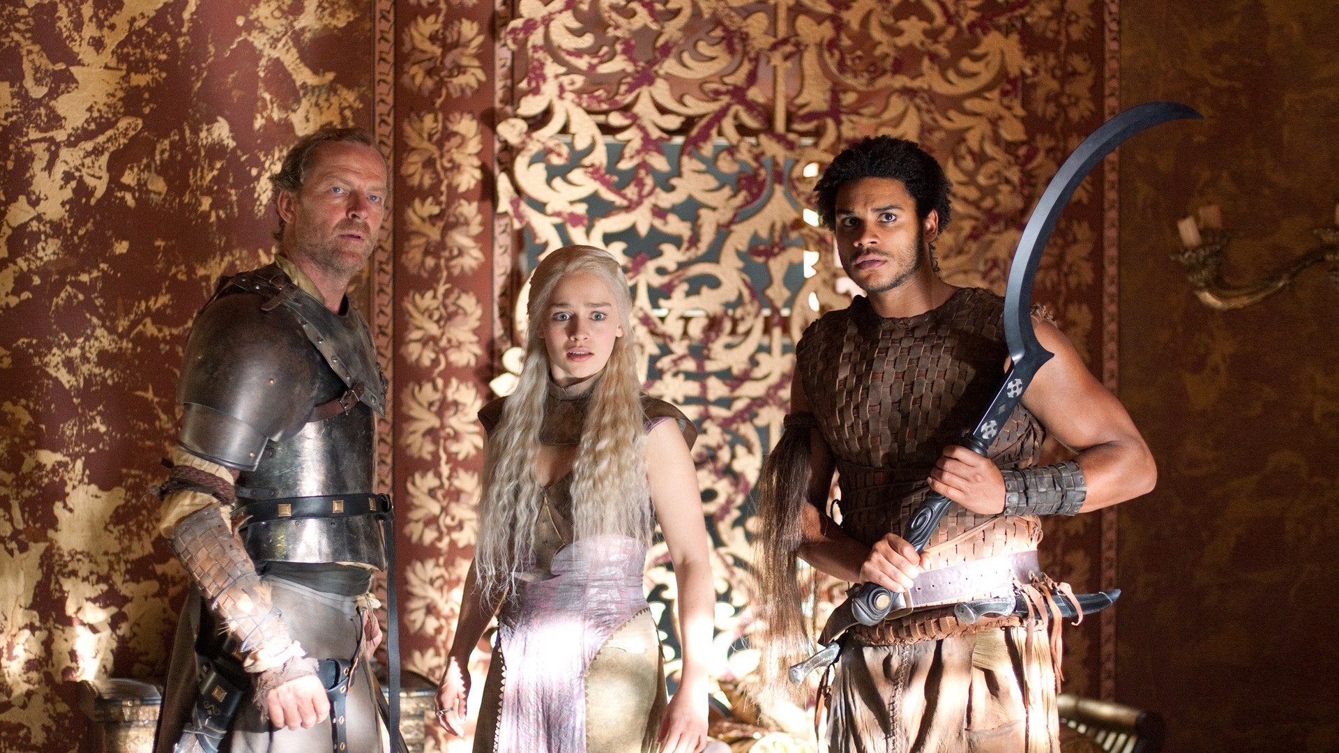 Description: A group of people standing next to each other in a room with a wallpapered wall and a large mirror.