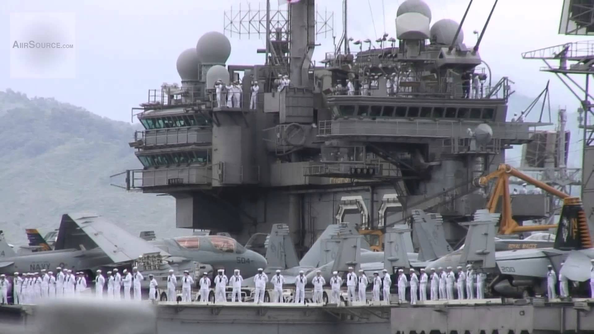 Description: A group of people standing on top of a ship next to a fighter jet flying over a mountain range.