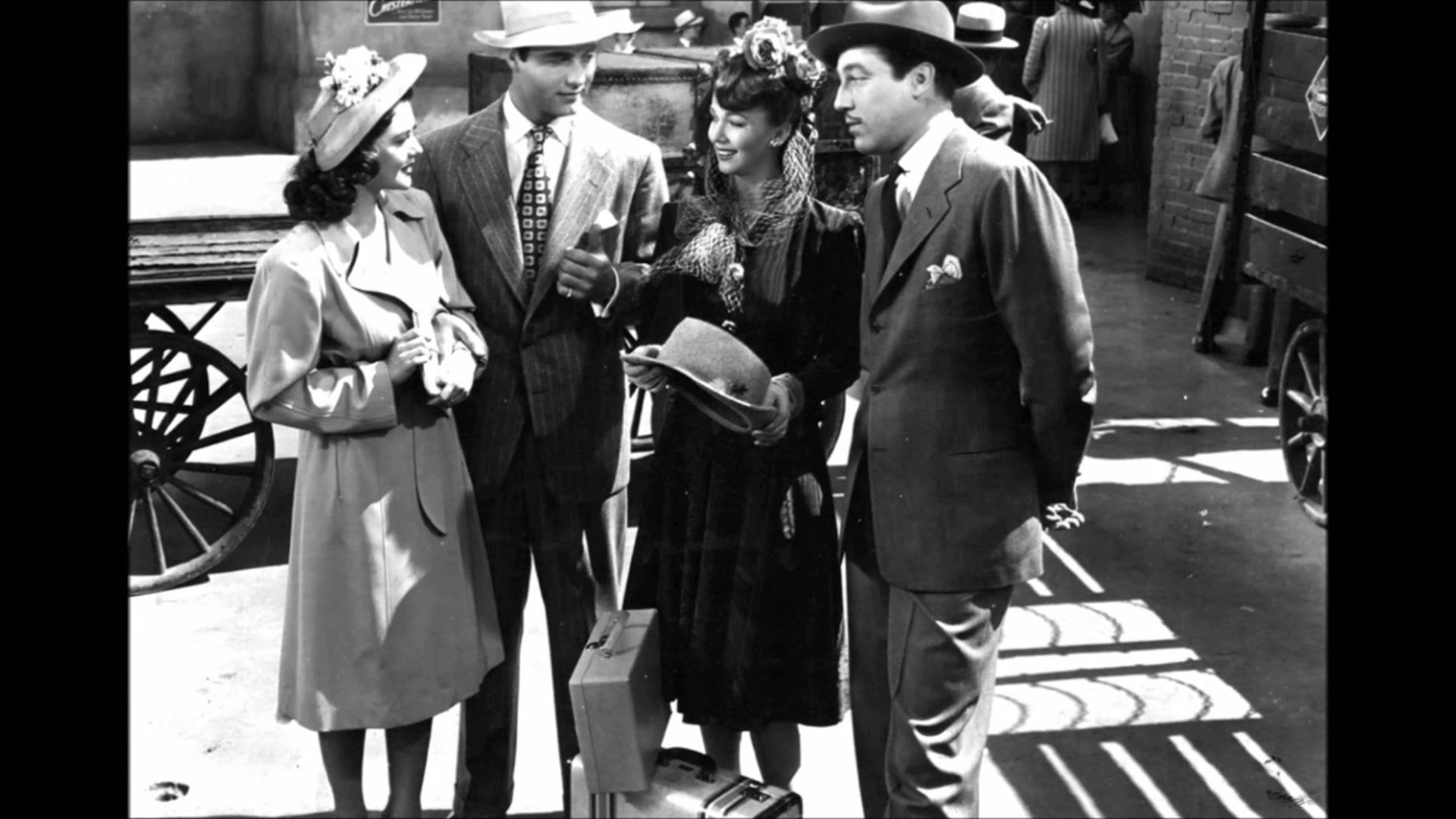 Description: A group of people standing next to each other on a sidewalk in a city street with a horse drawn carriage.