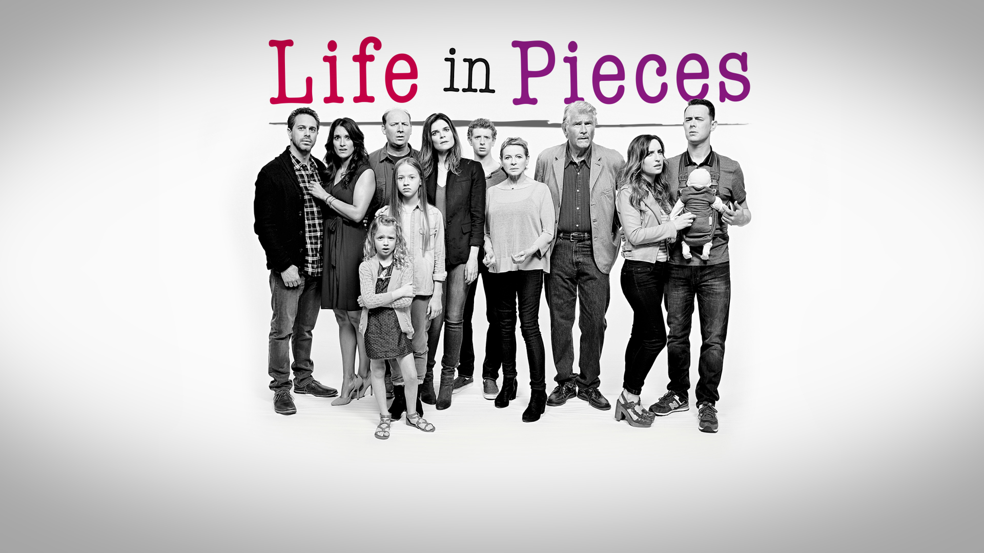 Description: A group of people standing next to each other in front of a sign that says life in pieces on it.