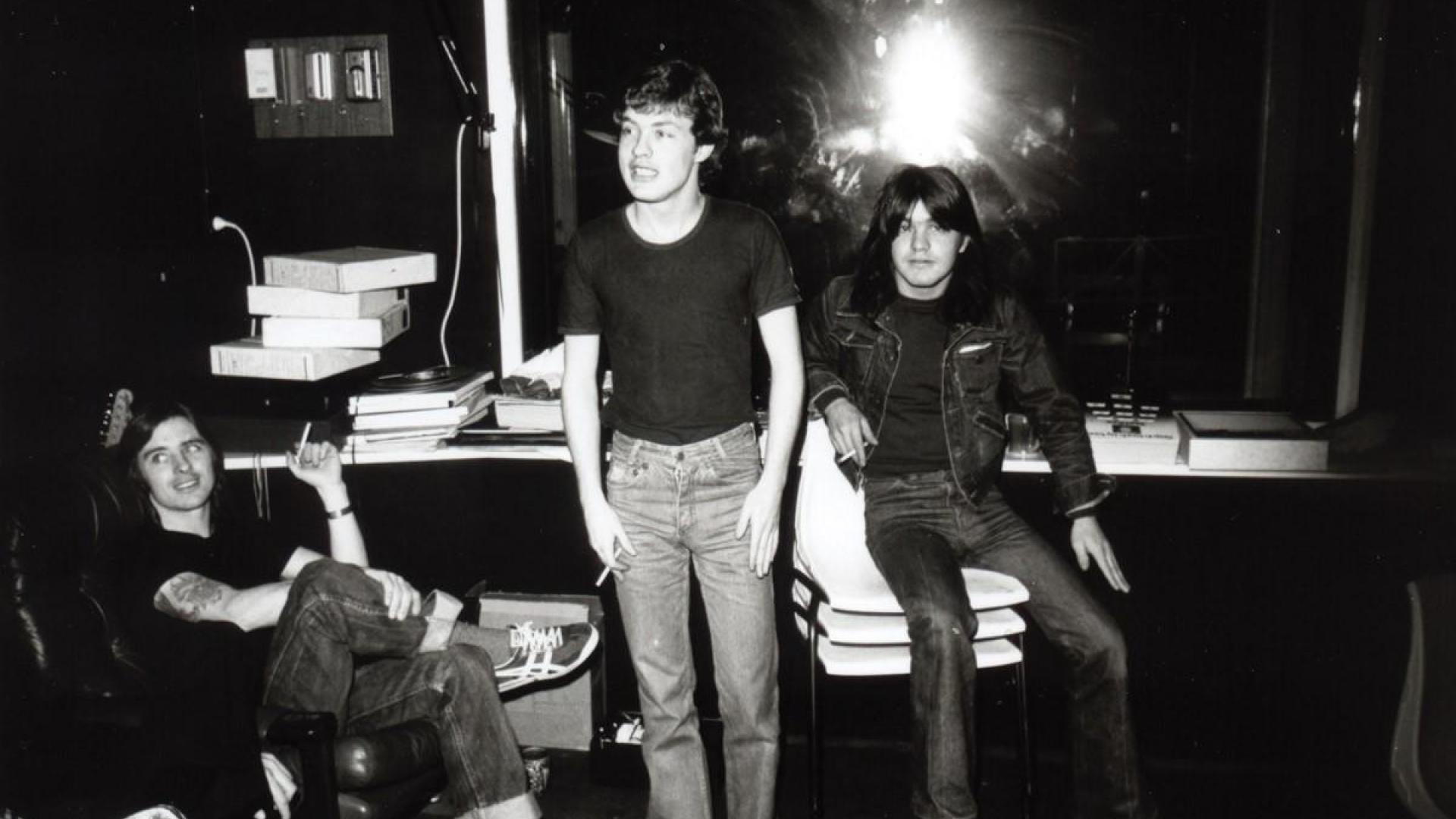 Description: A group of people sitting around a room with a desk and a chair in front of them and a man standing next to them.