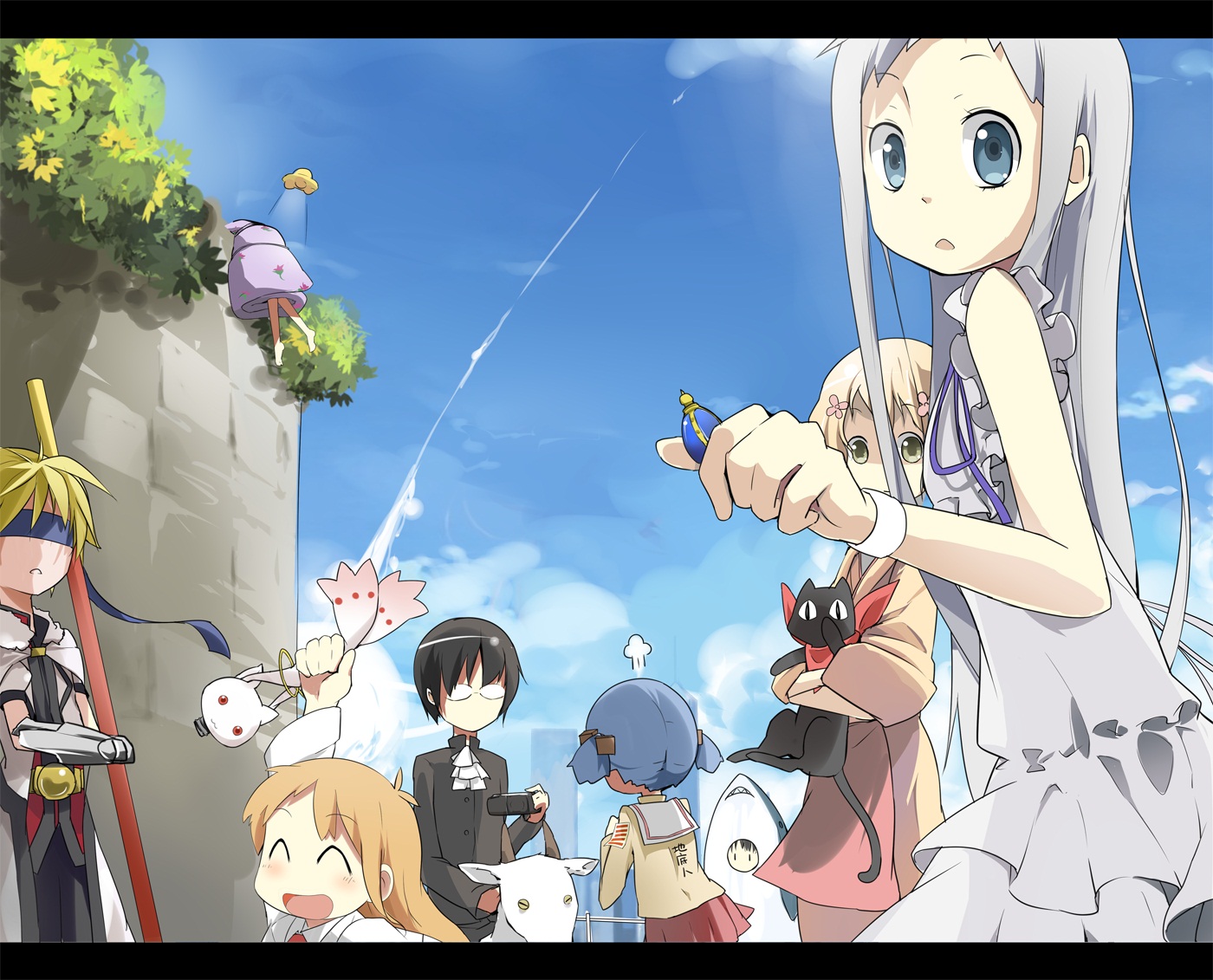 Description: A group of people standing around each other in front of a sky background with clouds and a sky background.