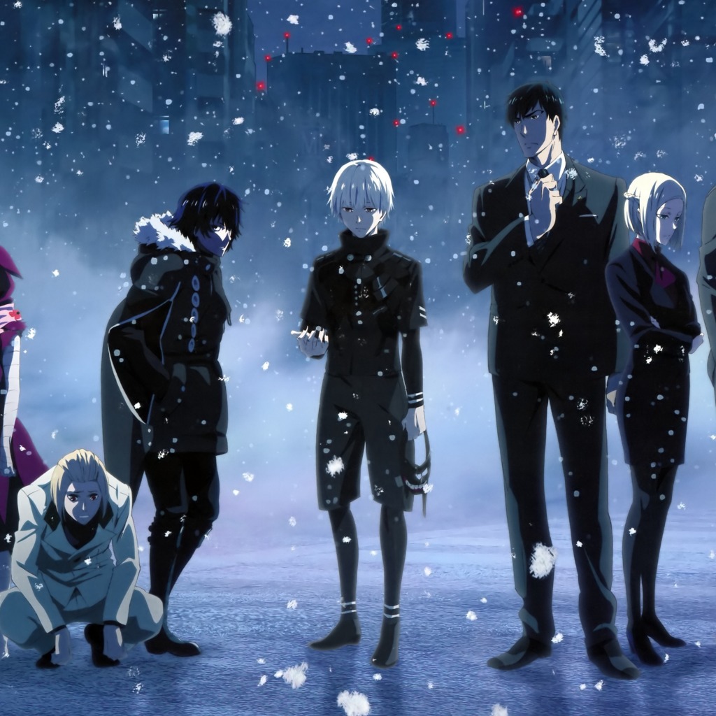 Description: A group of people standing next to each other in the snow with snow falling on them and a person in the foreground.