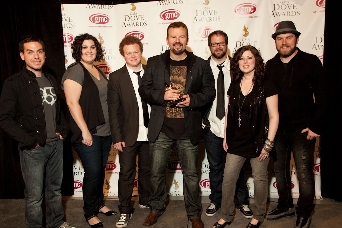 Description: A group of people standing next to each other on a stage with a backdrop behind them and a person holding a trophy.