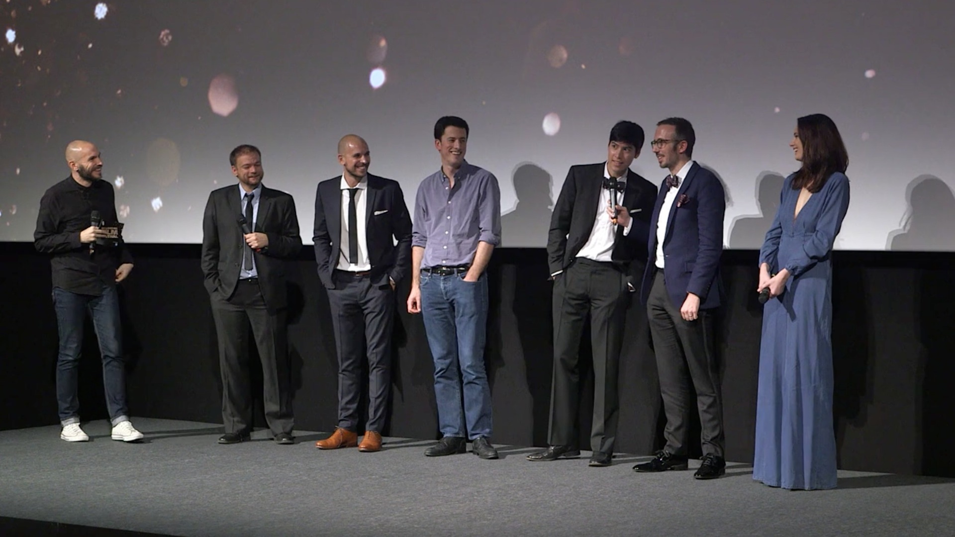 Description: A group of people standing on a stage with a projector screen behind them and a man in a suit and tie.