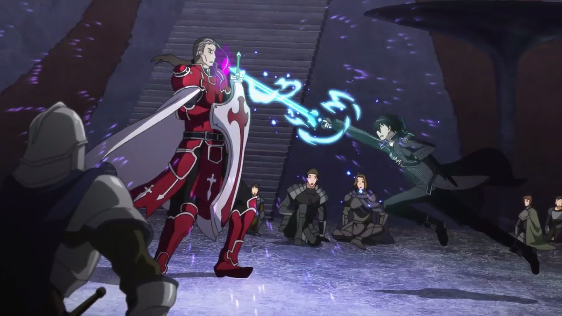 Description: A group of people standing around each other in front of a staircase with a sky background and a blue light.