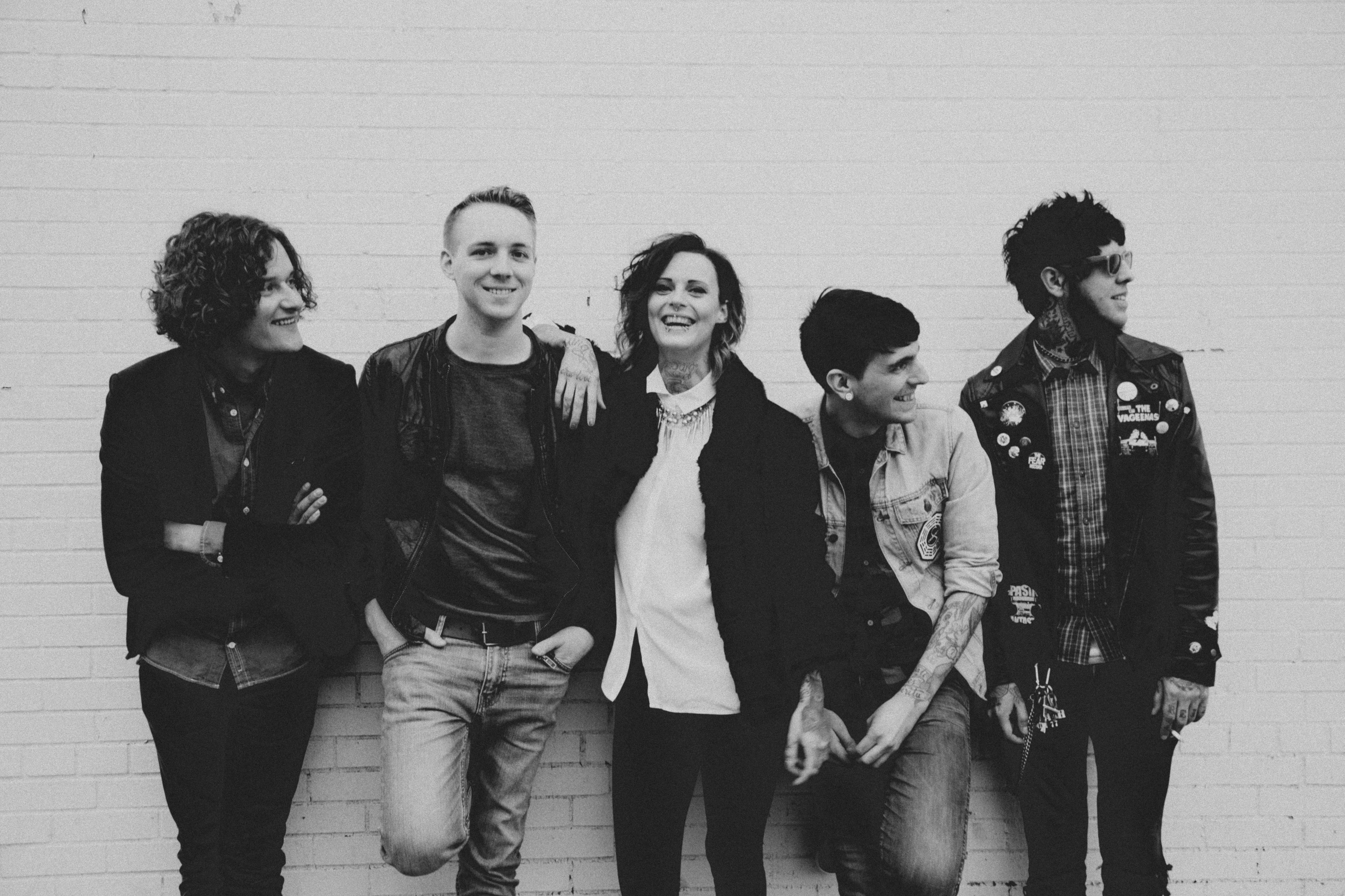 Description: A group of people standing next to each other near a wall with a brick wall behind them and a white brick wall behind them.