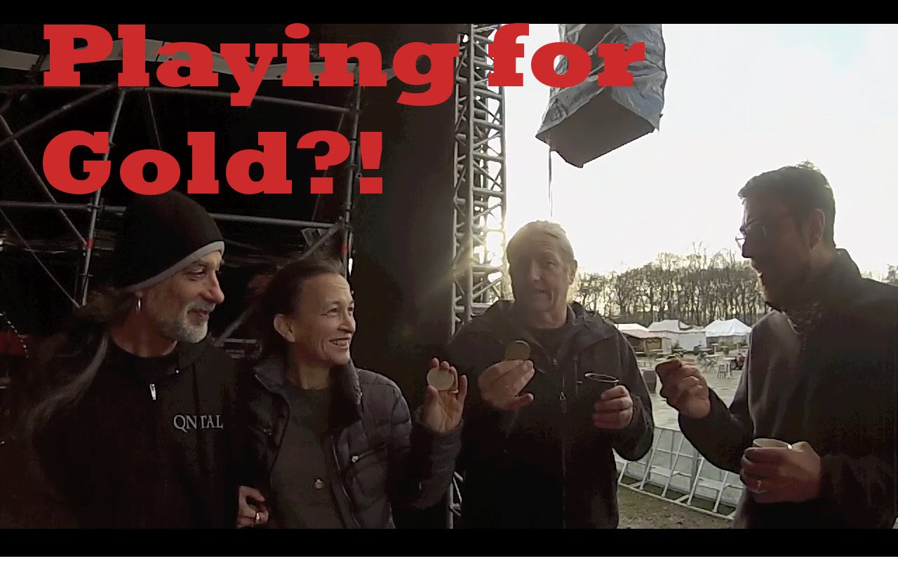 Description: A group of people standing around each other with a text overlay that reads playing for gold??.