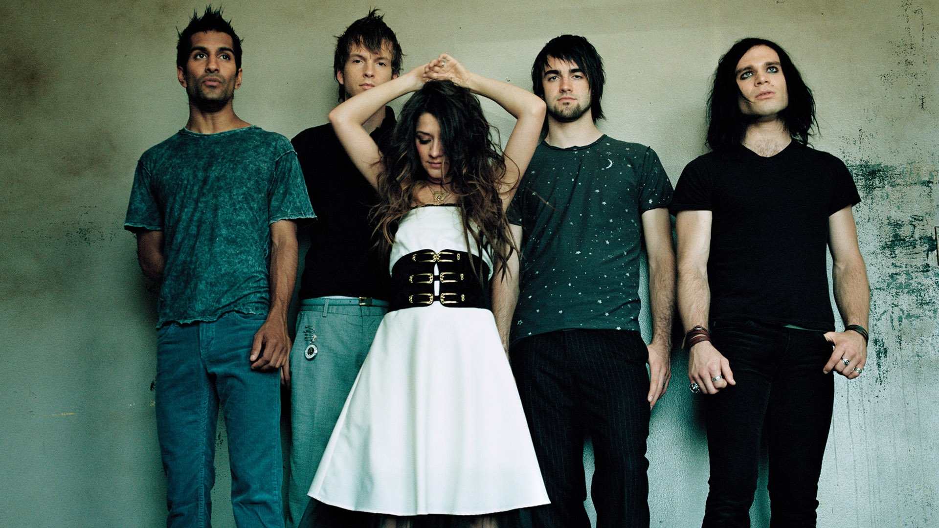 Description: A group of people standing next to each other in front of a wall with a woman in a white dress.