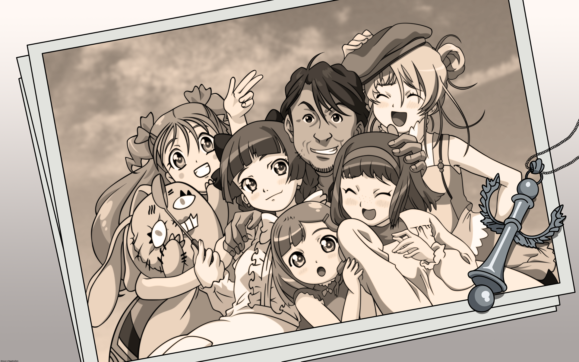 Description: A group of people are posing for a picture together with a sword in front of them and a picture frame with a cartoon character.