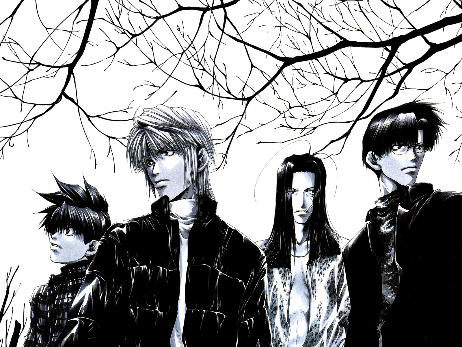Description: A group of people standing next to each other under a tree with no leaves on it and one man wearing a black jacket.