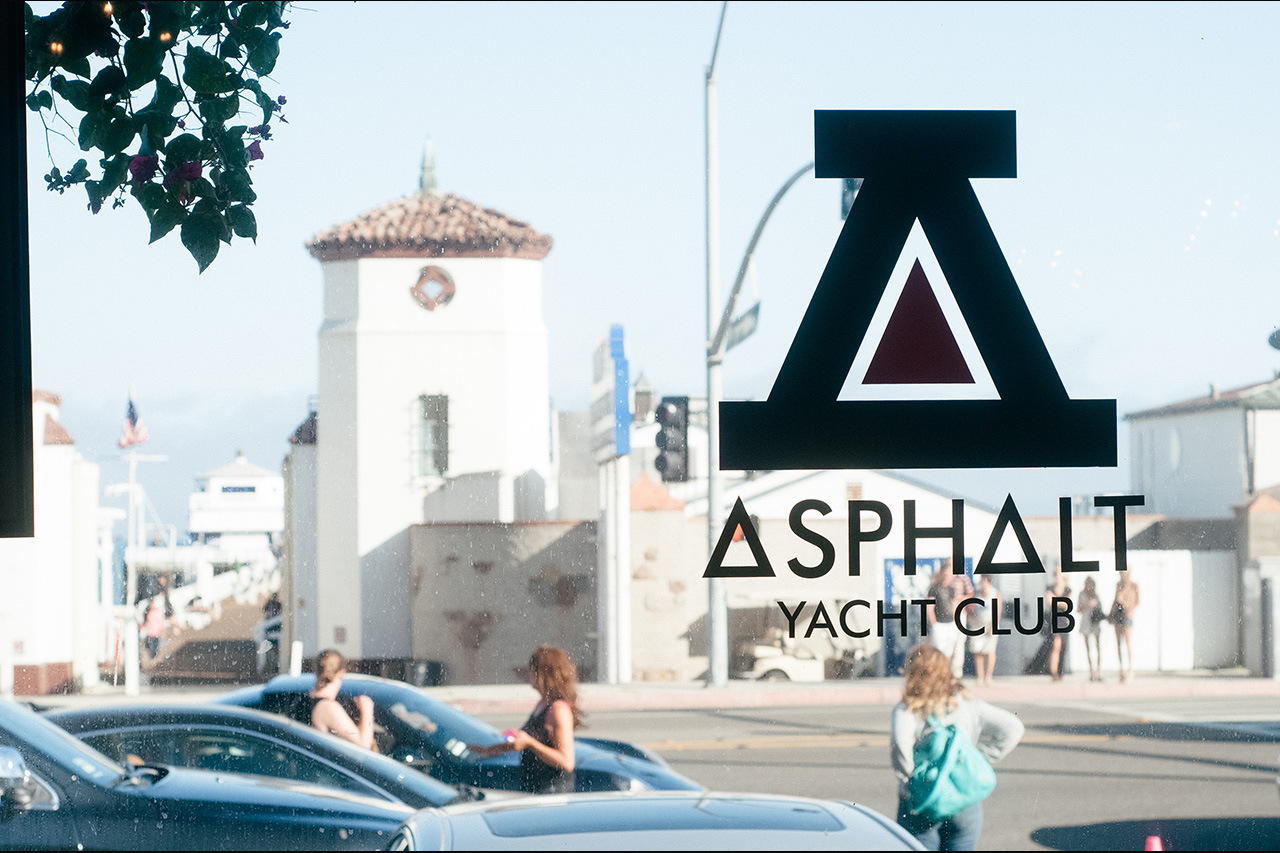Description: A group of people walking down a street next to a tall building with a logo on it's side.