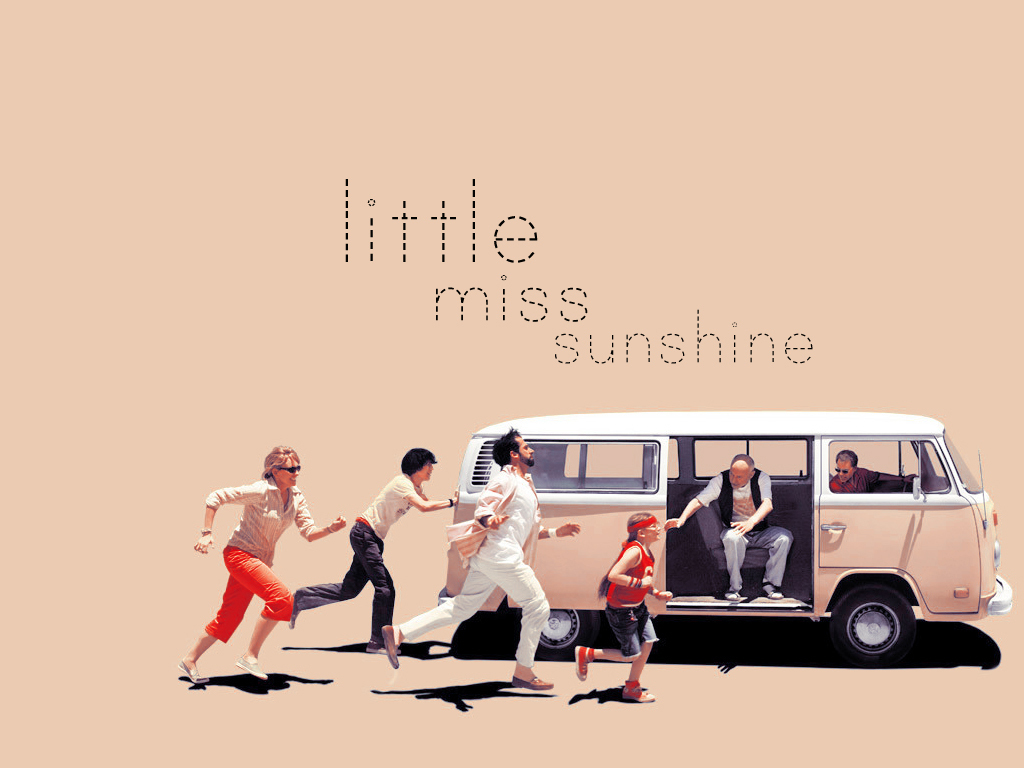 Description: A group of people walking across a street next to a van with the words little miss sunshine on it.