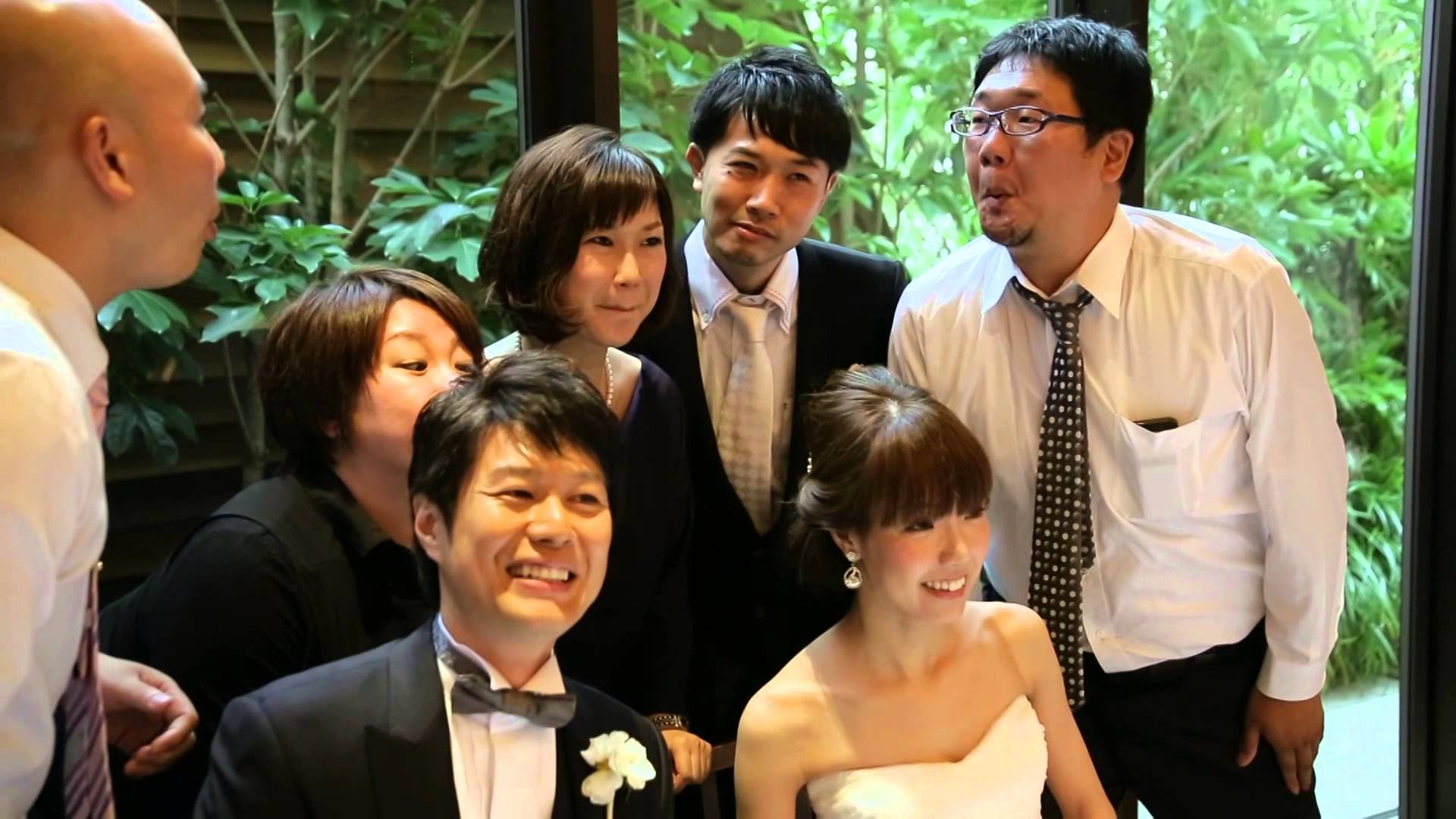 Description: A group of people standing next to each other in front of a window with trees in the background and a woman in a white dress.