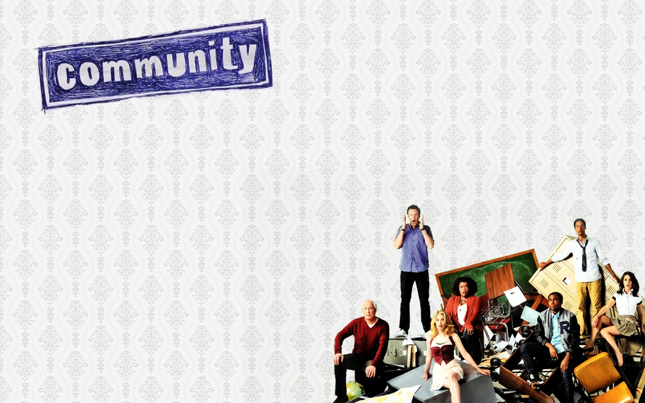 Description: A group of people sitting on top of a pile of luggage and a sign that says community above them.