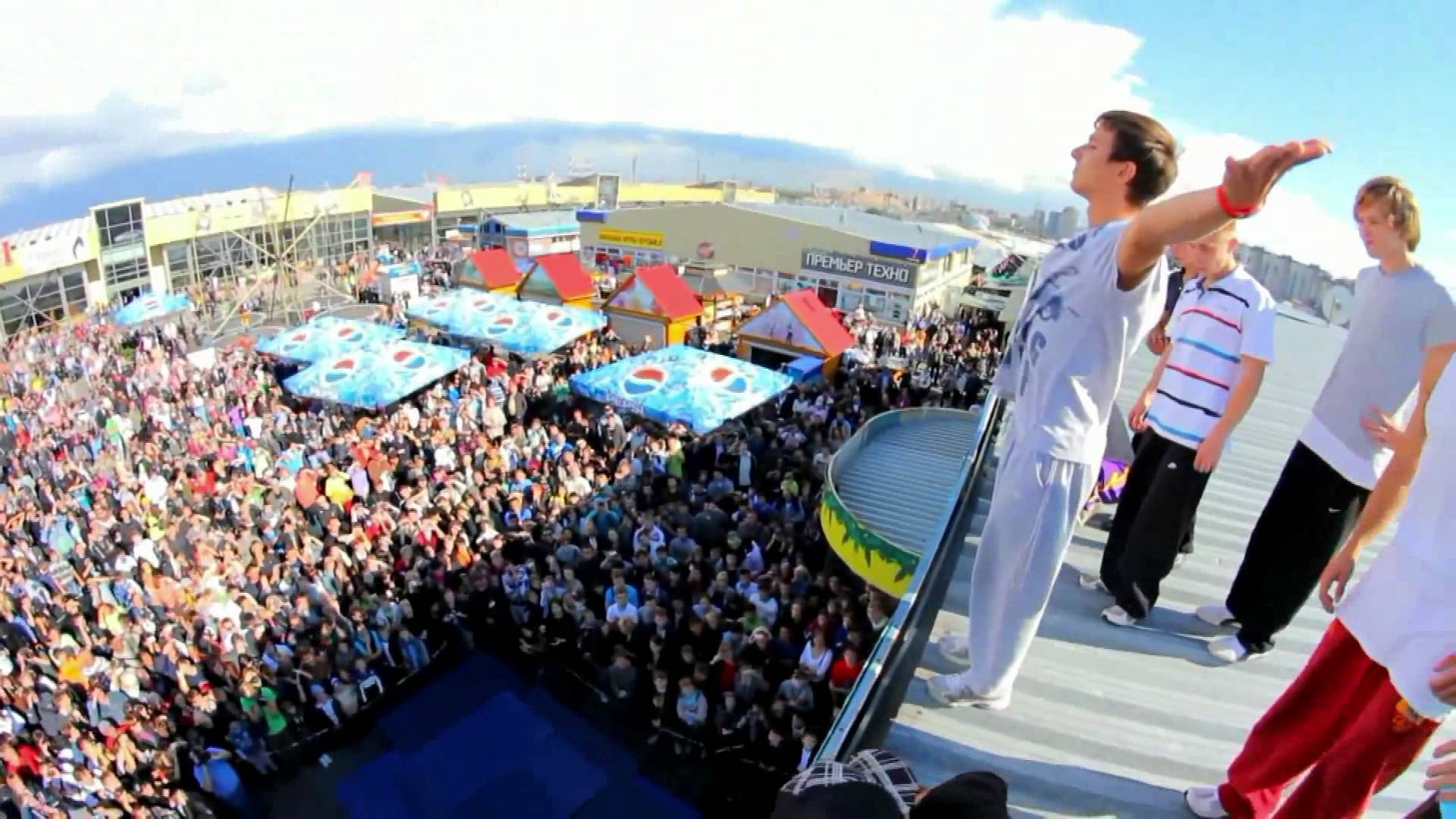 Description: A group of people standing around a stage with a crowd watching them from the top of it and a man on the side of the stage.