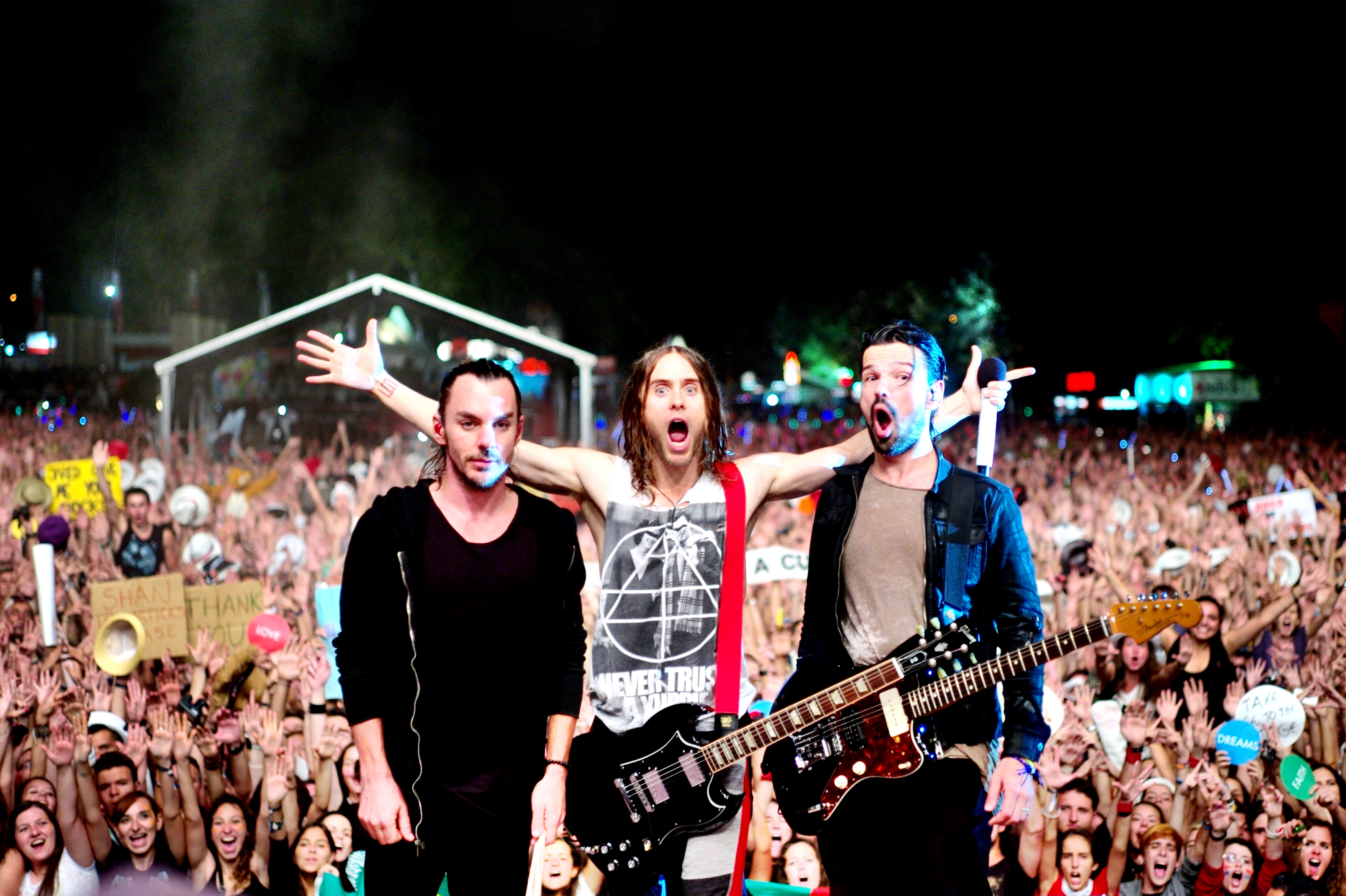 Description: A group of people standing around a stage with guitars and microphones in front of them and a crowd of people.