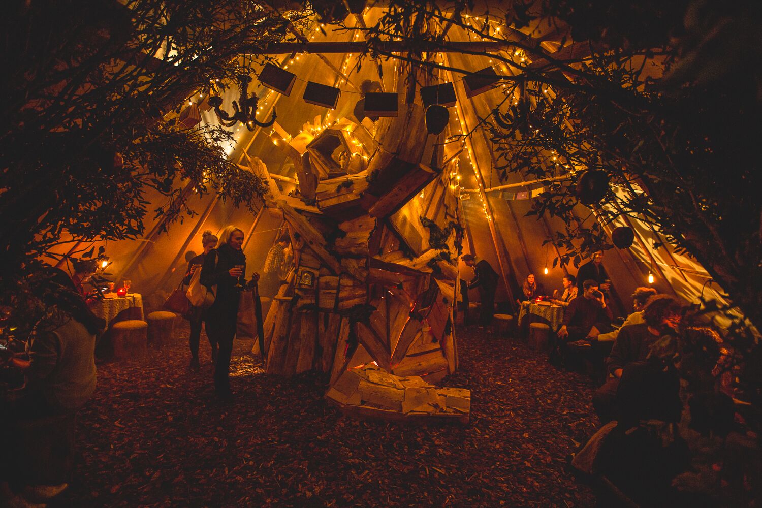 Description: A group of people standing around a tent with lights on it and a statue of a man on a horse.