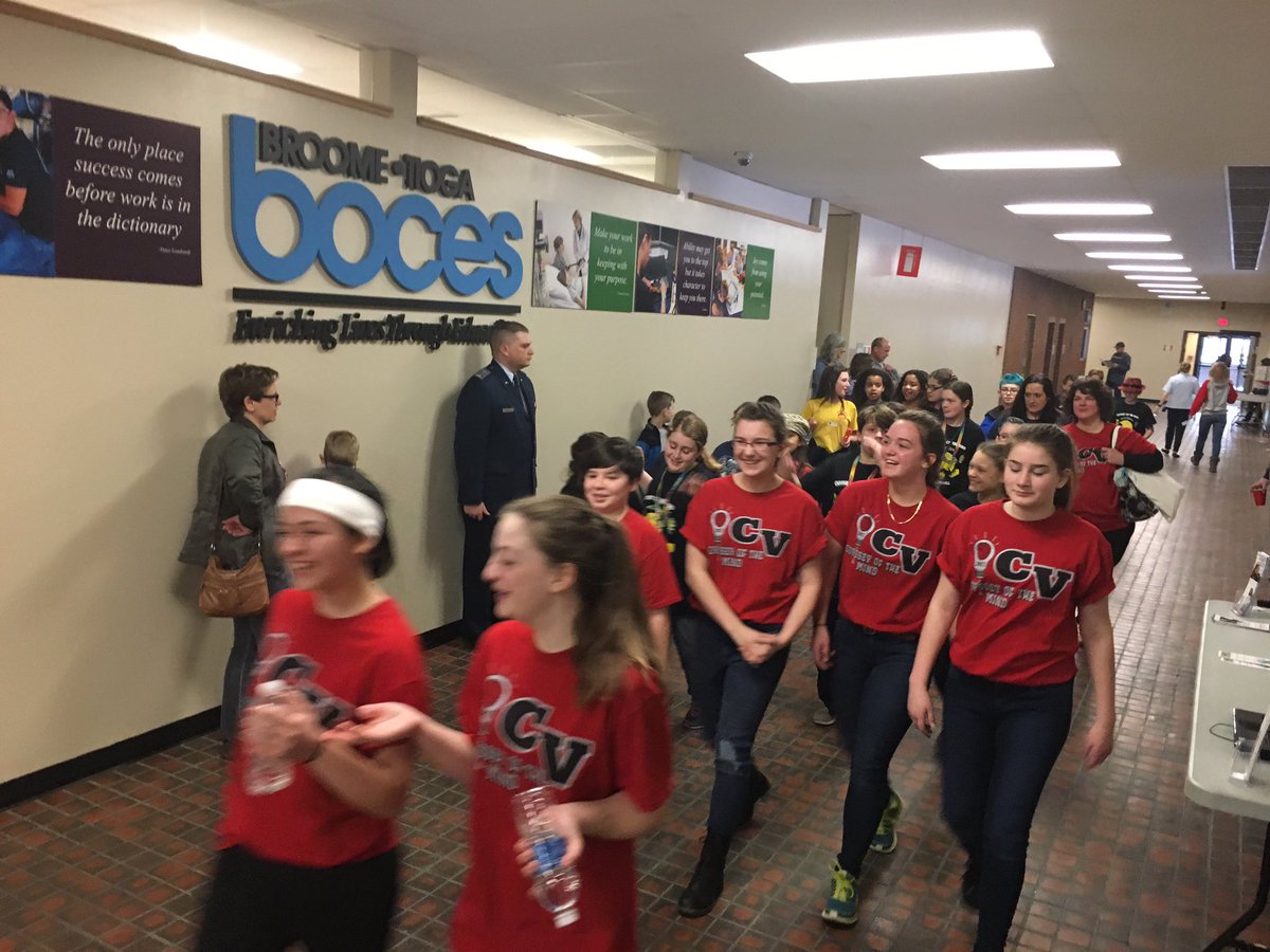 Description: A group of people walking down a hallway next to a wall with a sign on it that says.