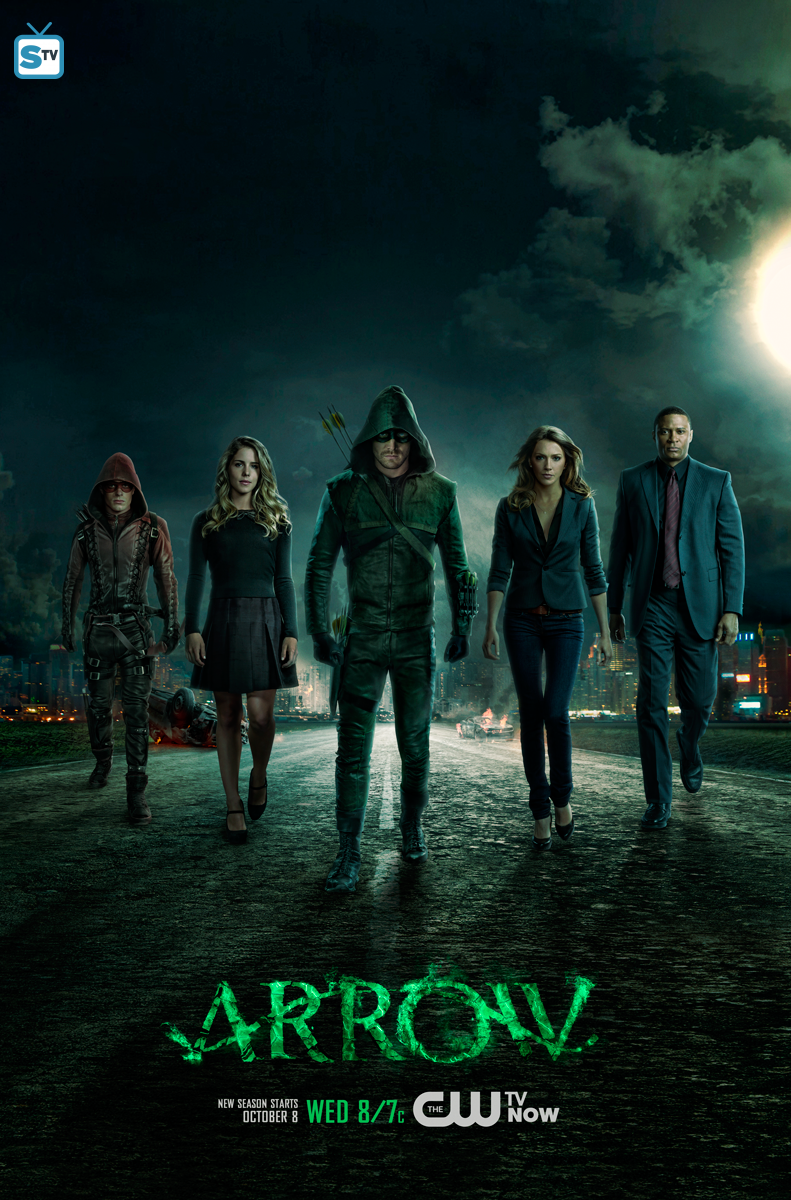 Description: A group of people walking down a street at night with the moon in the background and the words arrow on the poster.