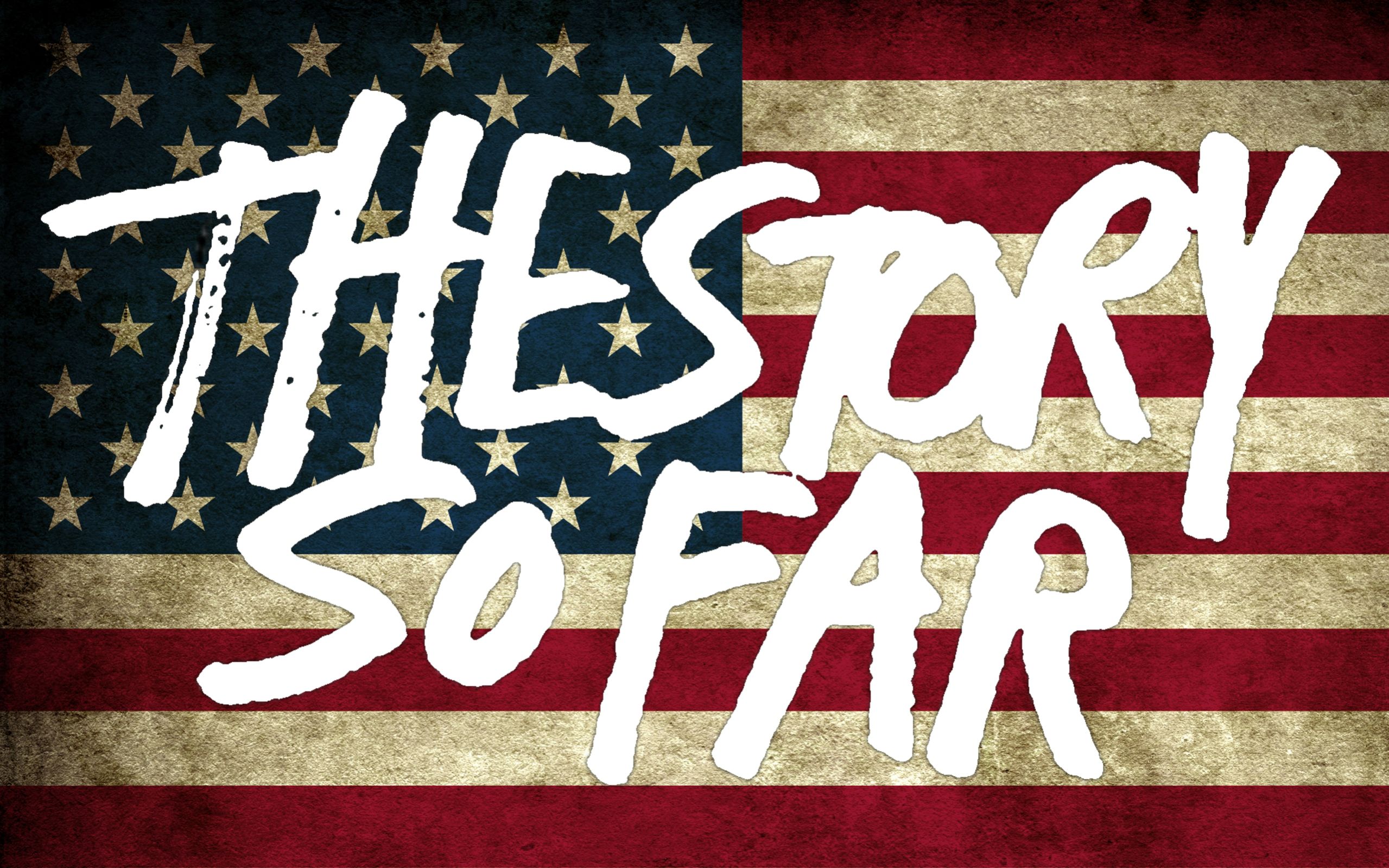 Description: A grungy american flag with the words the story so far on it in white lettering on a red.