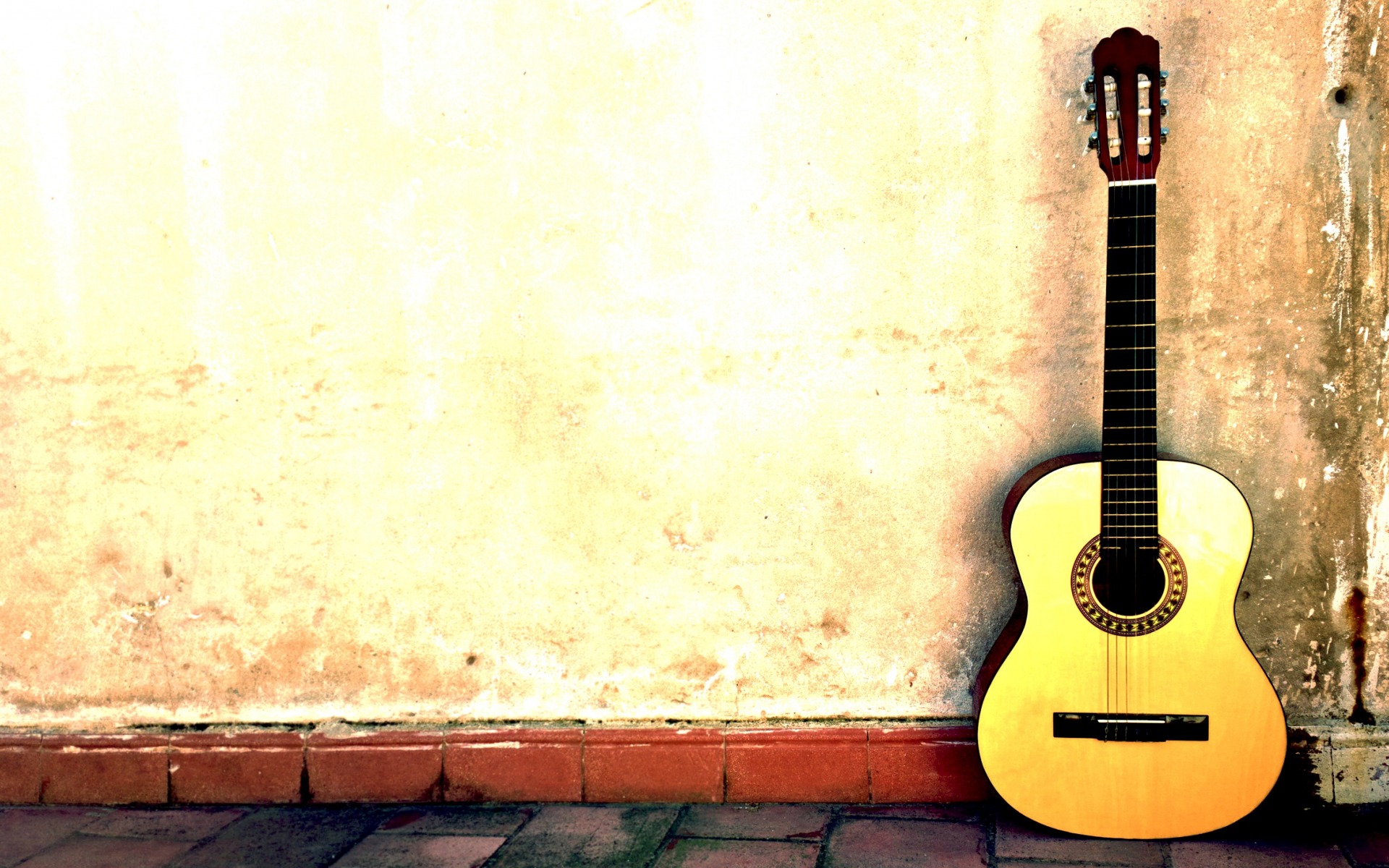 Description: A guitar leaning against a wall on a brick floor in front of a wall with a cement wall behind it.