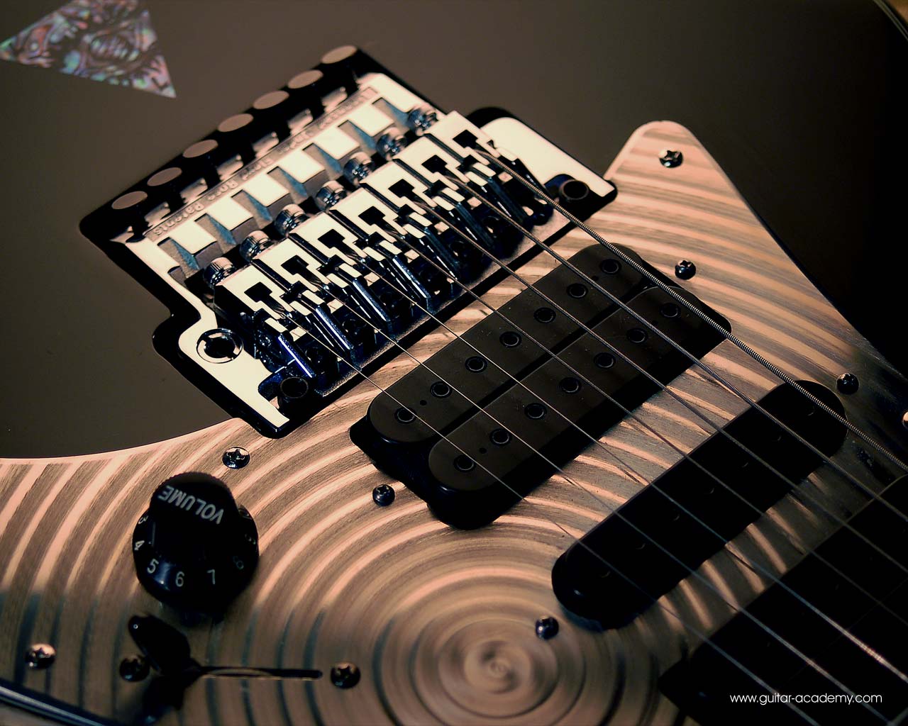 Description: A close up of a guitar with a black and white guitar picker on it's neck and a black and white guitar picker.