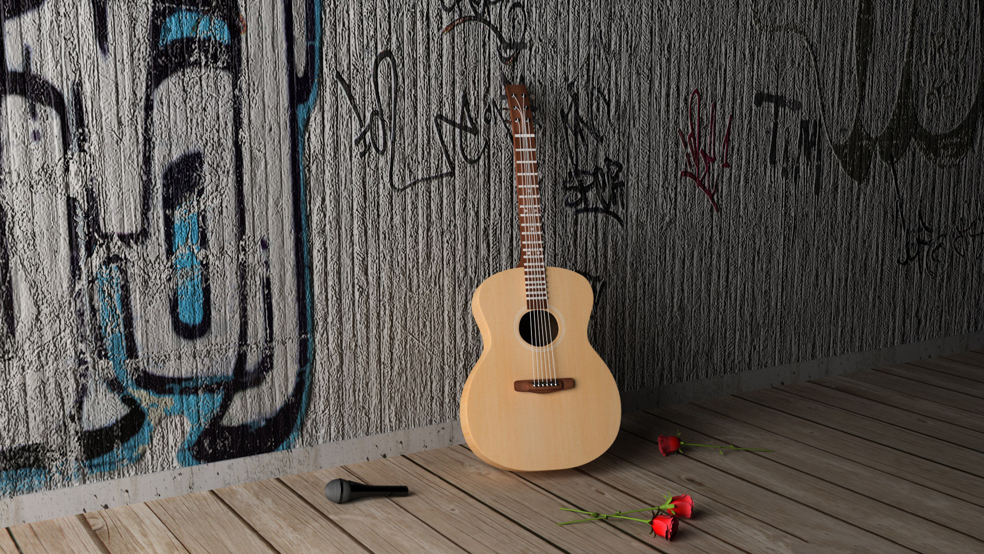 Description: A guitar is sitting on the floor in front of a wall with graffiti on it and a flower in the foreground.