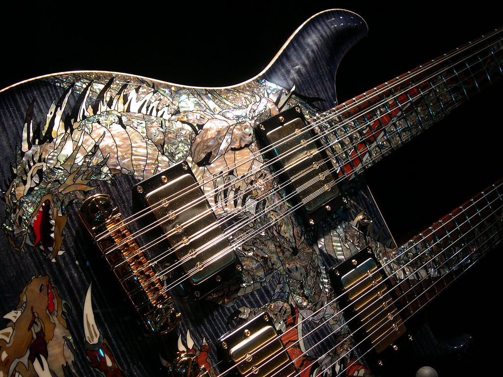 Description: A close up of a guitar with a mosaic design on it's body and neck and strings.