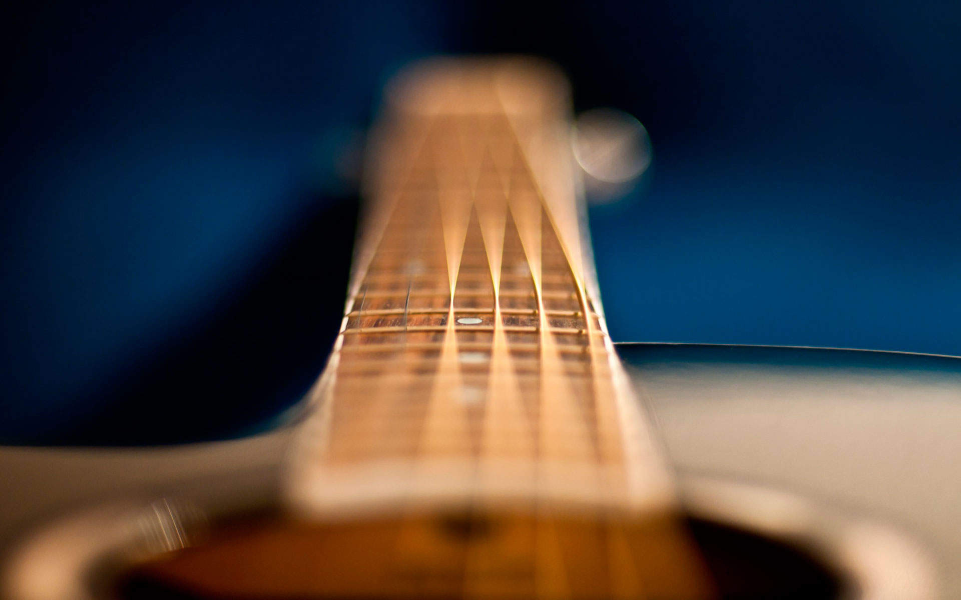 Description: A close up of a guitar neck with a blurry background of the fret and fret section.