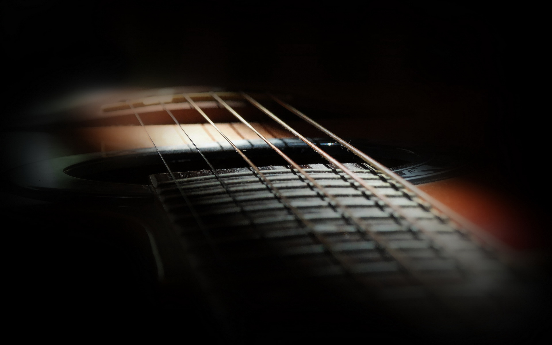 Description: A close up of a guitar neck and strings in the dark room of a house or office building.