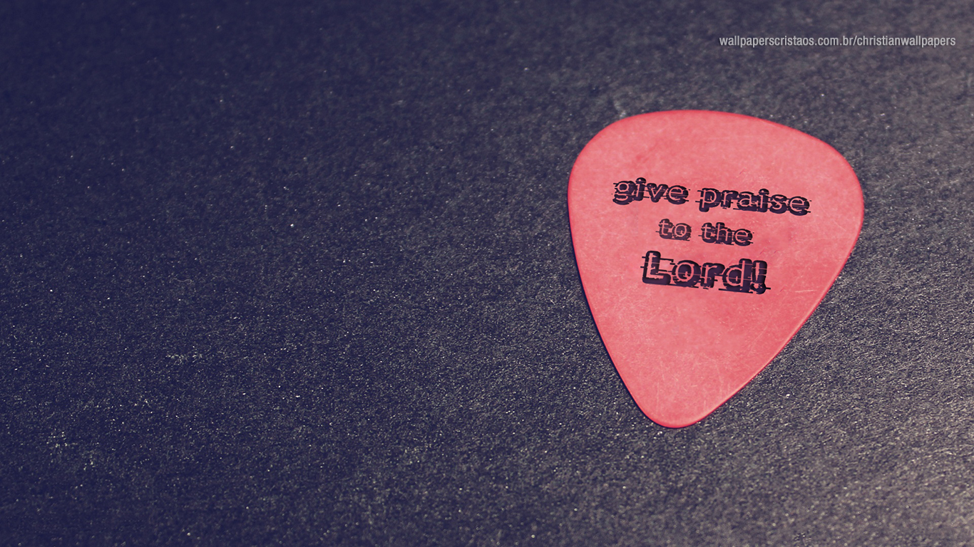 Description: A guitar pick with a message on it that says give peace to the lord on it on a black surface.