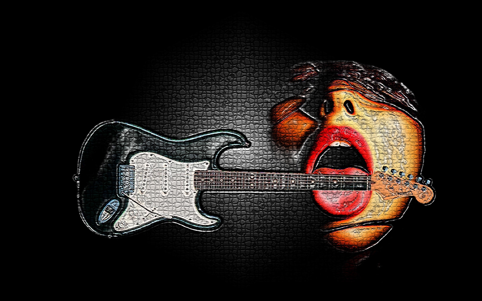 Description: A guitar and a woman's face with their mouths open and their mouths open.