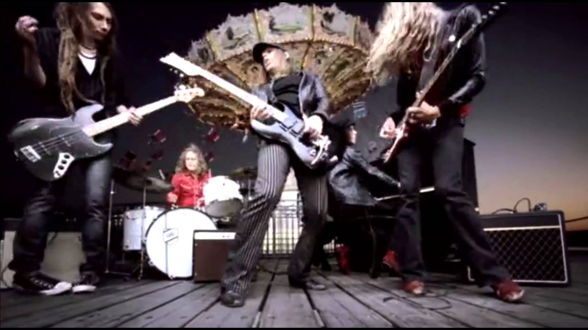 Description: A group of people playing guitars on a stage with a woman in the background and a man in the foreground.
