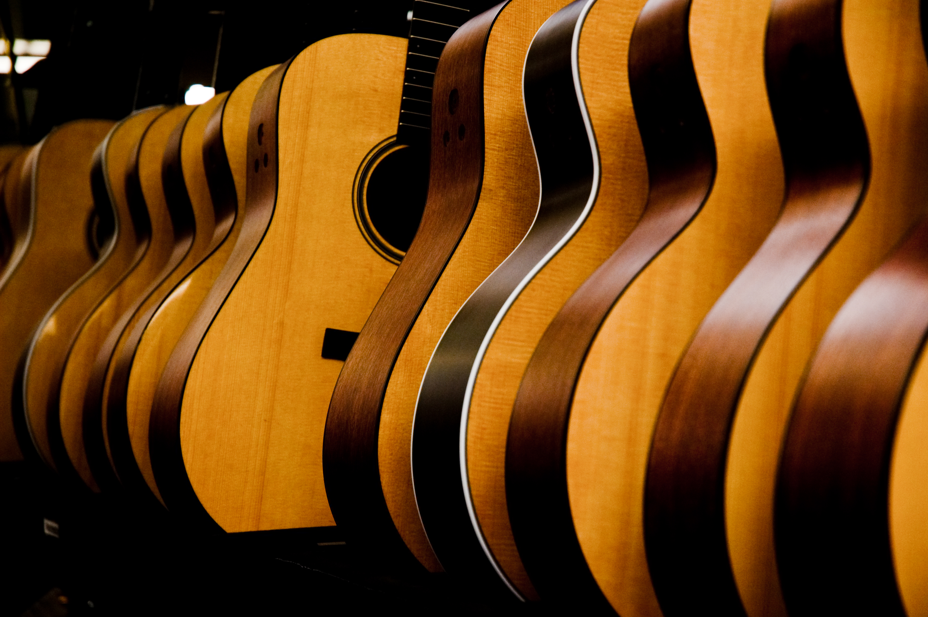 Description: A row of guitars lined up in a store or shop.