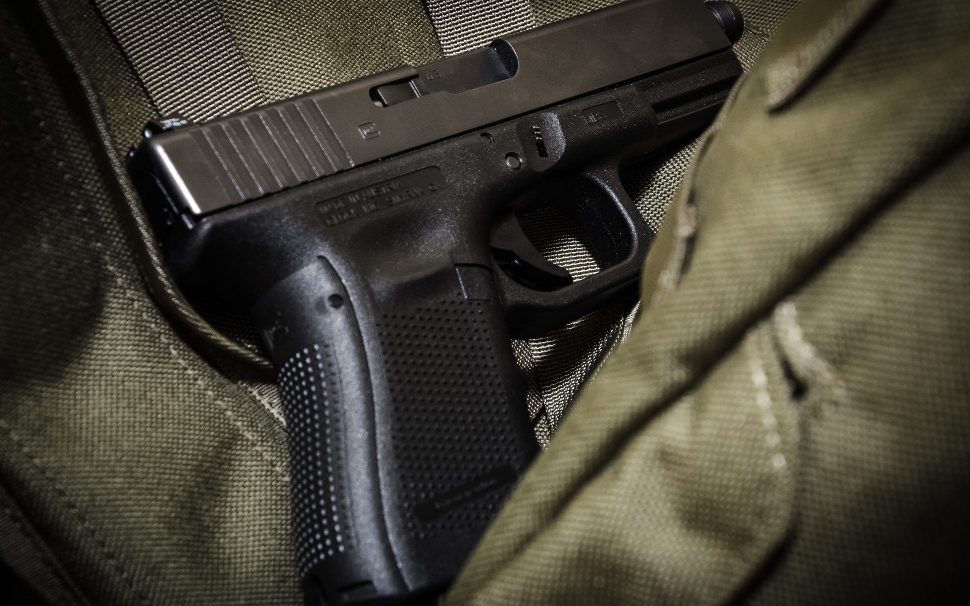 Description: A gun is laying on a backpack with a backpack behind it and a backpack behind it that has a backpack with a gun in it.