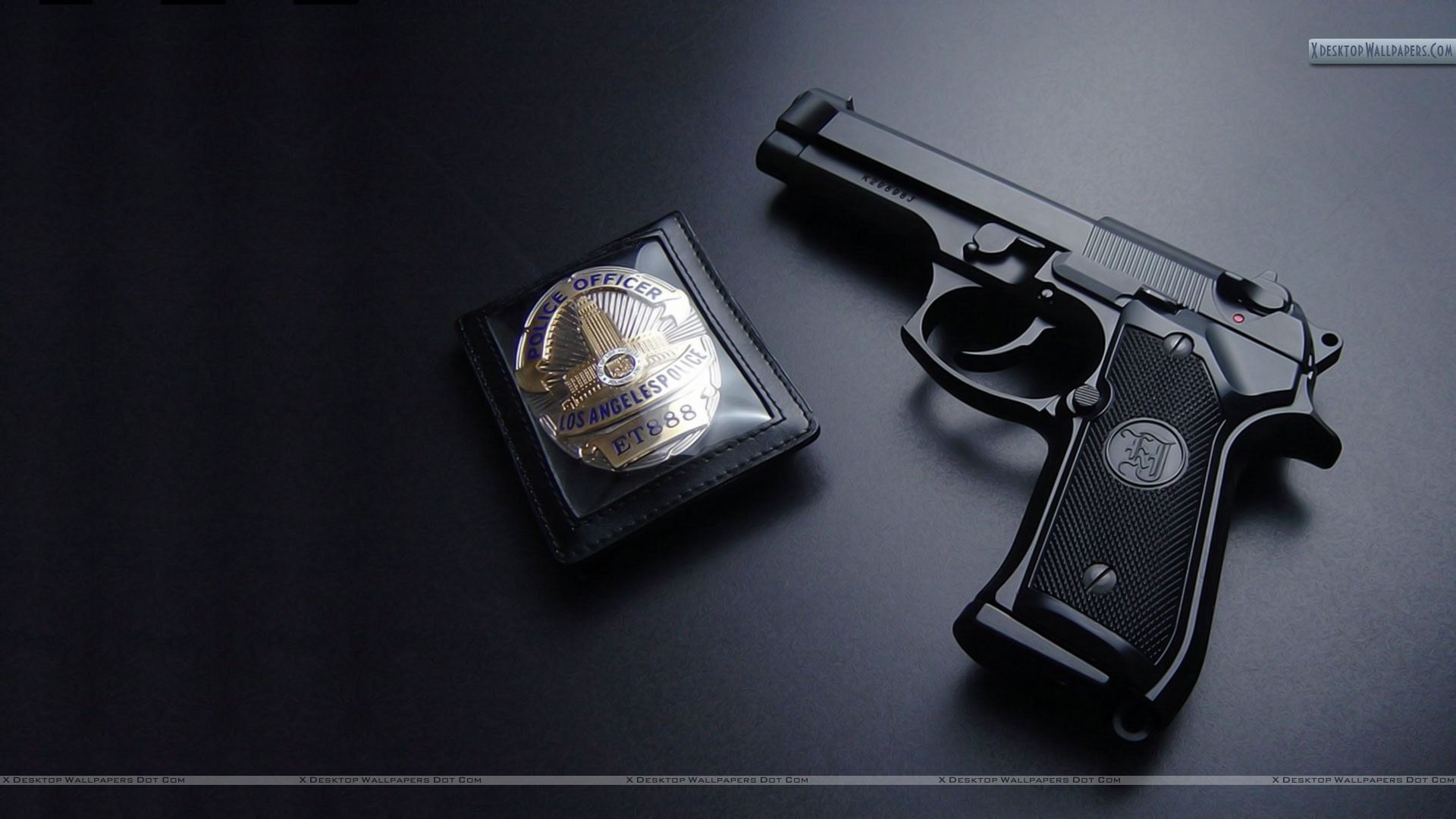 Description: A gun and a badge on a table with a black background and a black background with a silver border.