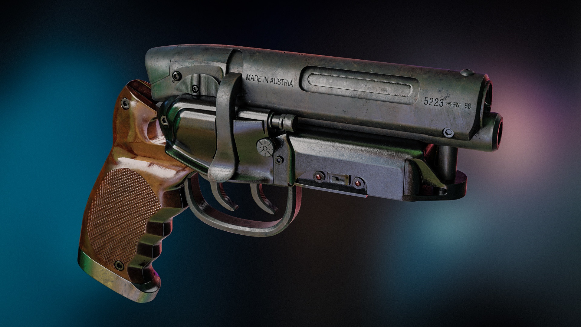 Description: A close up of a gun with a blue background behind it and a blurry background behind it.