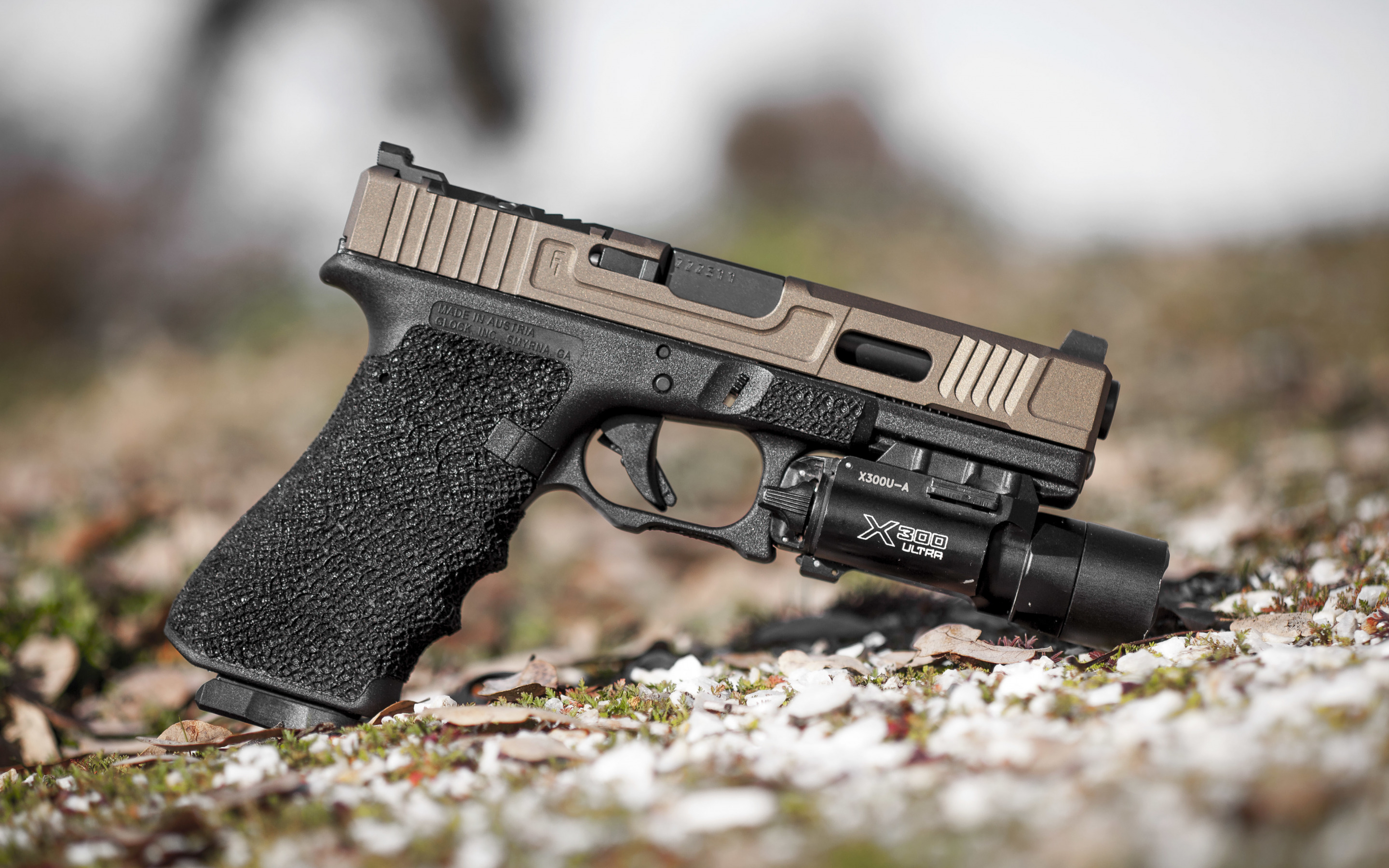 Description: A gun laying on the ground with a flashlight on it's side and a blurry background of leaves.