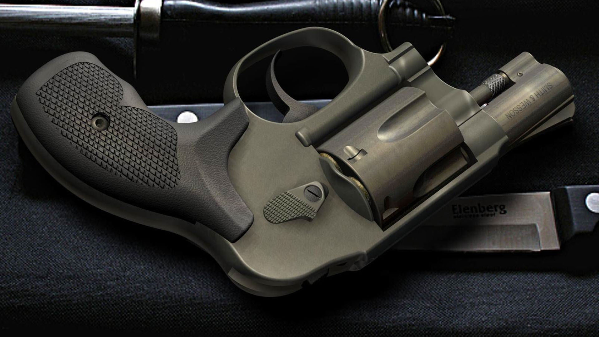 Description: A gun and a knife on a black surface with a black background and a black background with a black background.
