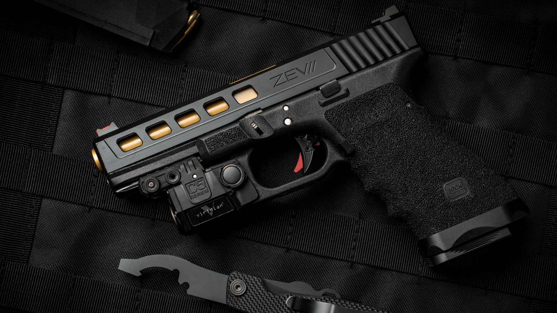 Description: A gun laying on a black cloth with a knife next to it and a knife rest on the ground.