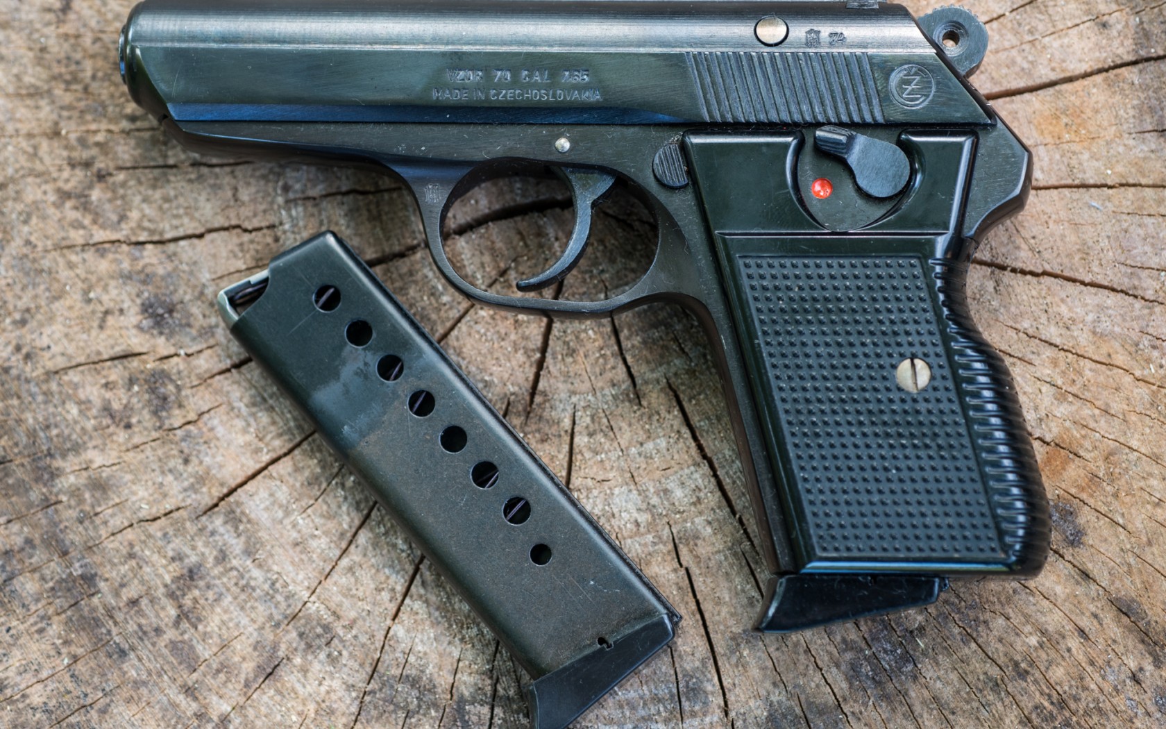 Description: A gun and a magazine on a wooden table top with a knife and a lighter on it.
