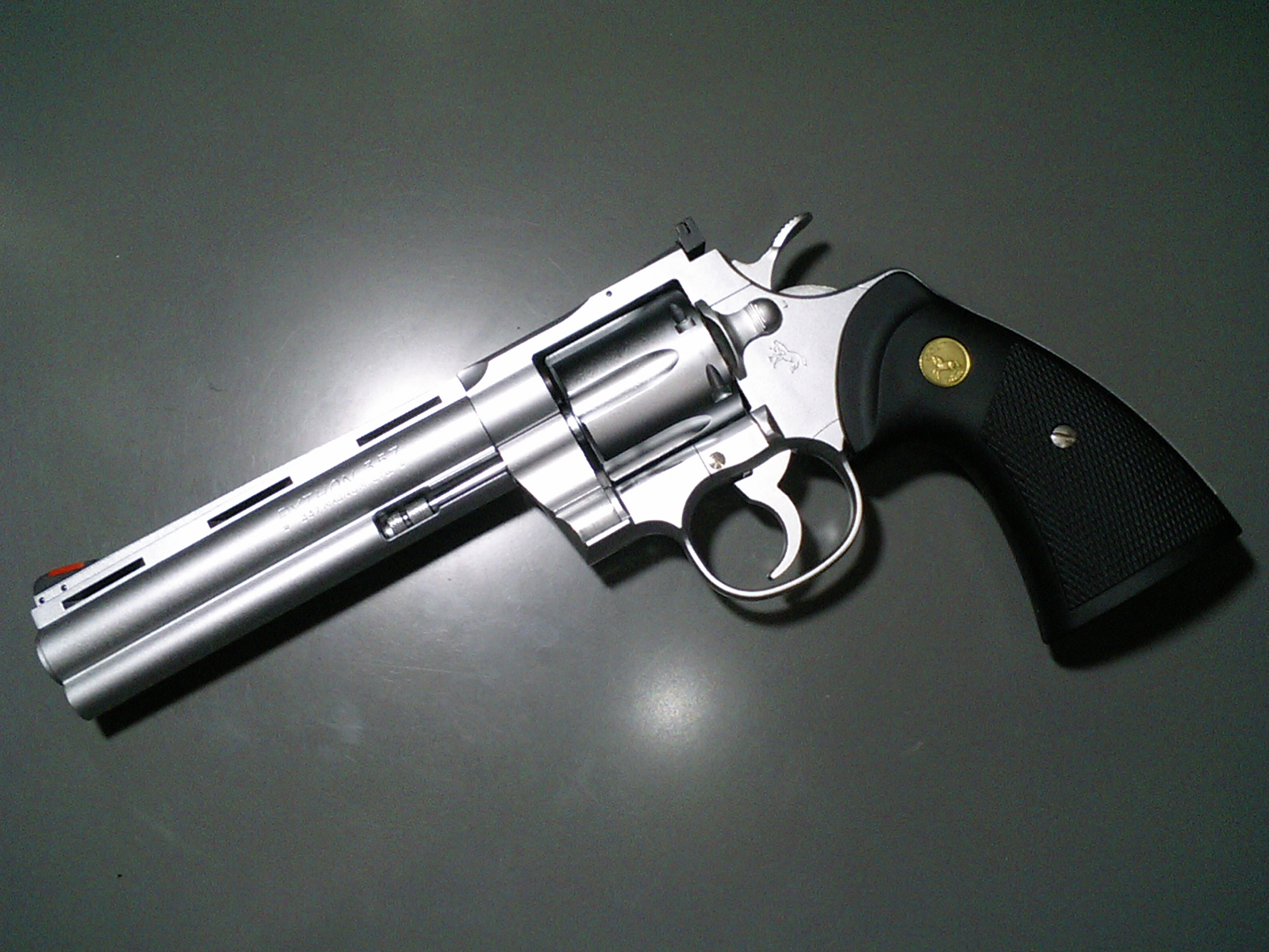 Description: A gun with a silver finish on a table top with a black background and a yellow button on the side.