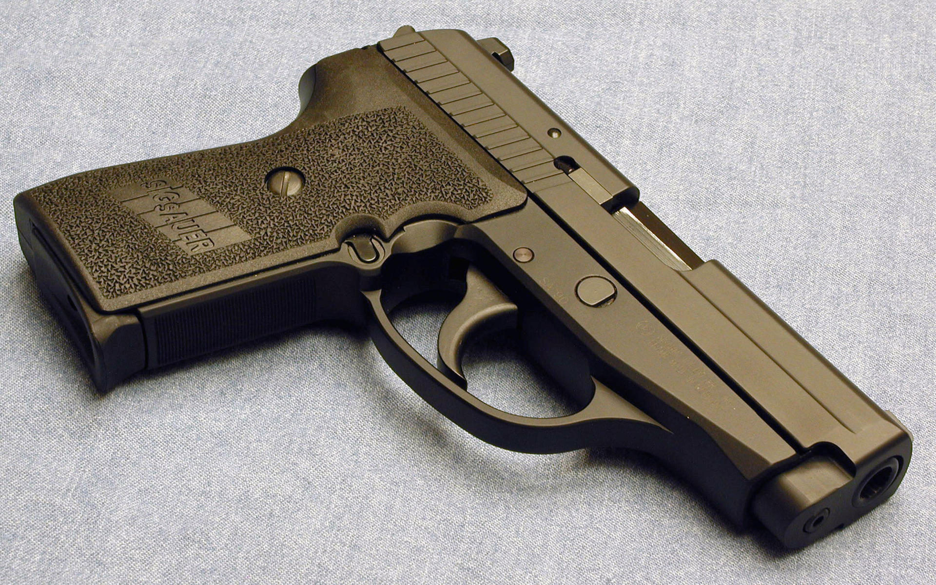 Description: A gun that is on a table with a light blue background and a black handle and the gun is facing the camera.