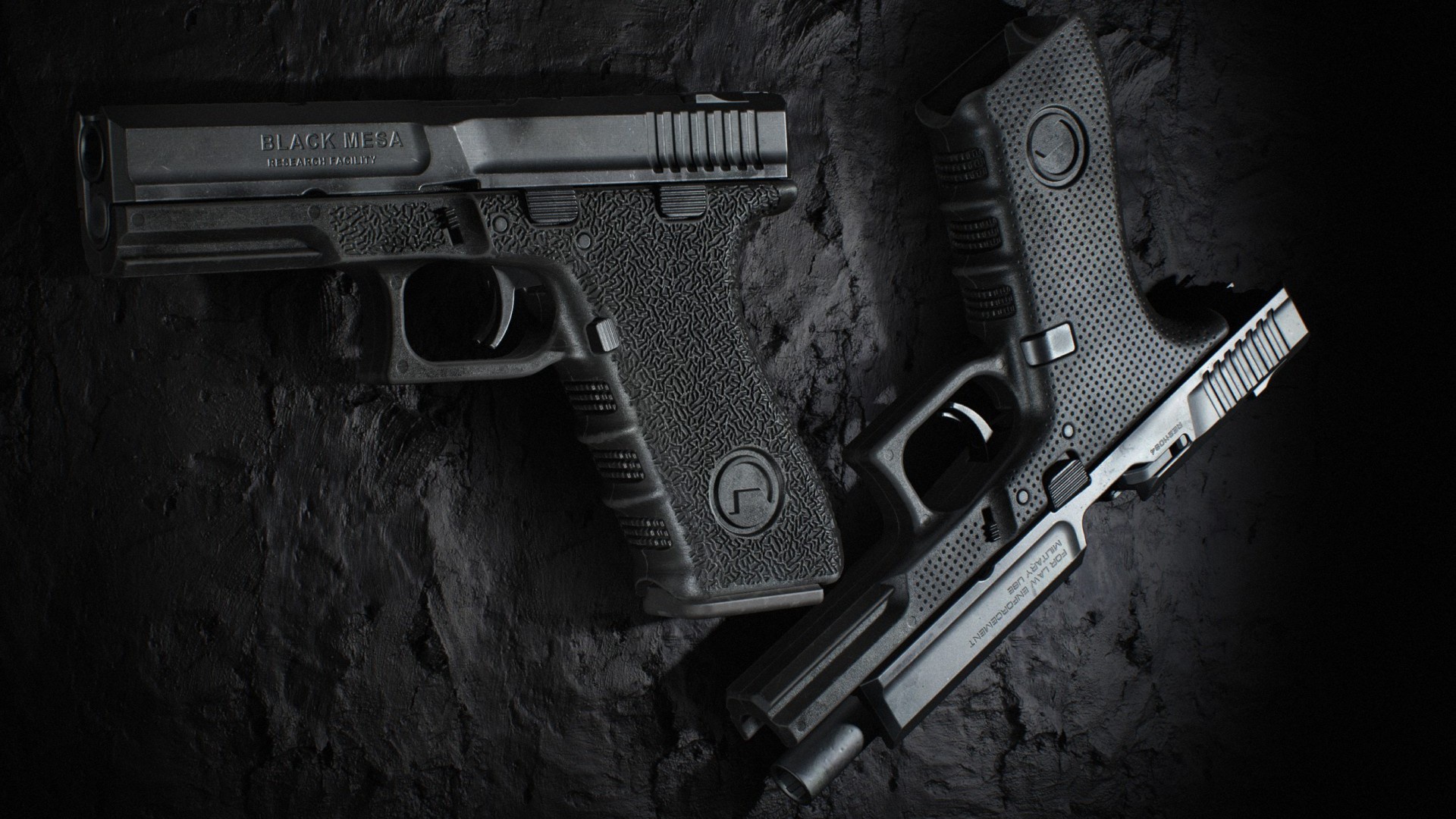 Description: A couple of guns that are on a table in the dark room.