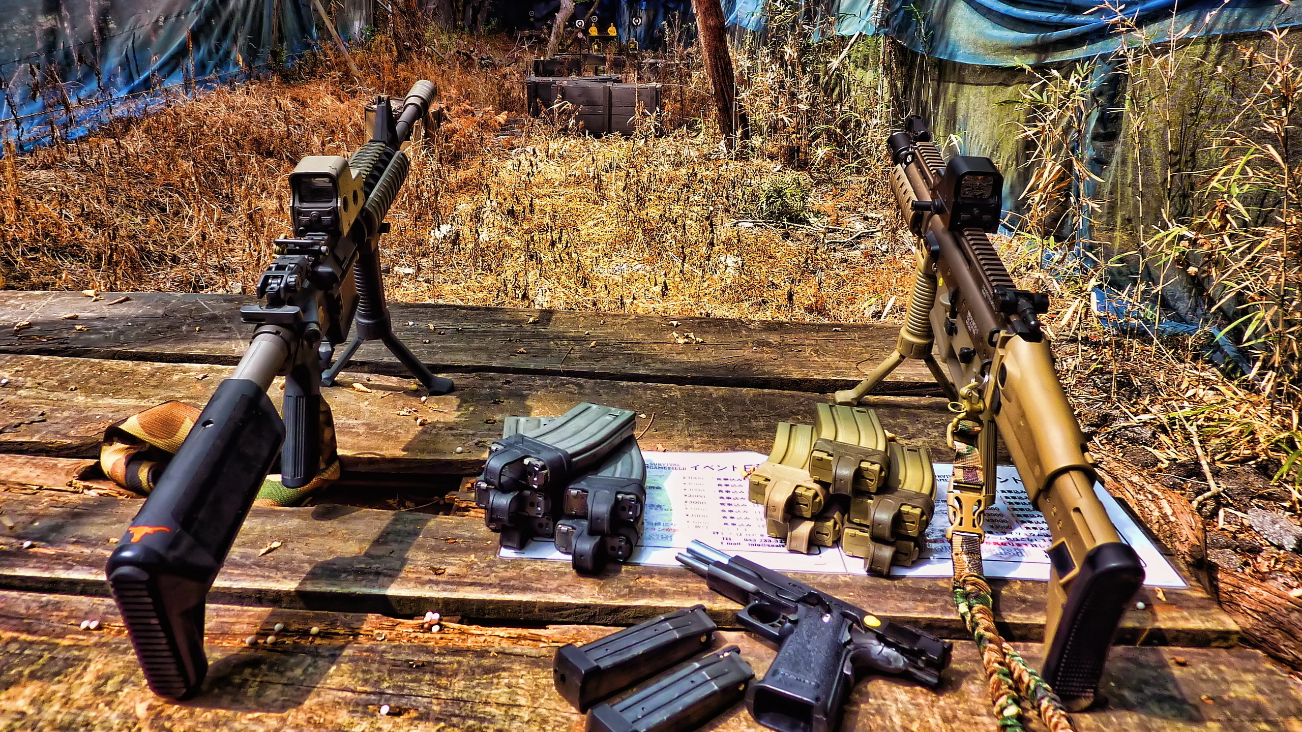 Description: A bunch of guns and guns on a table in a field with a tent in the background and a sheet of paper on the ground.
