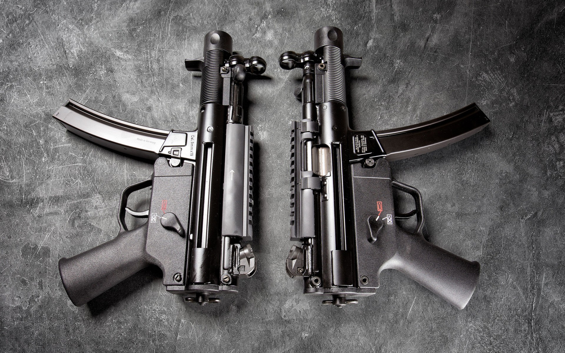 Description: Two guns are sitting on a table with a gun in the middle of the picture and another gun in the middle of the picture.