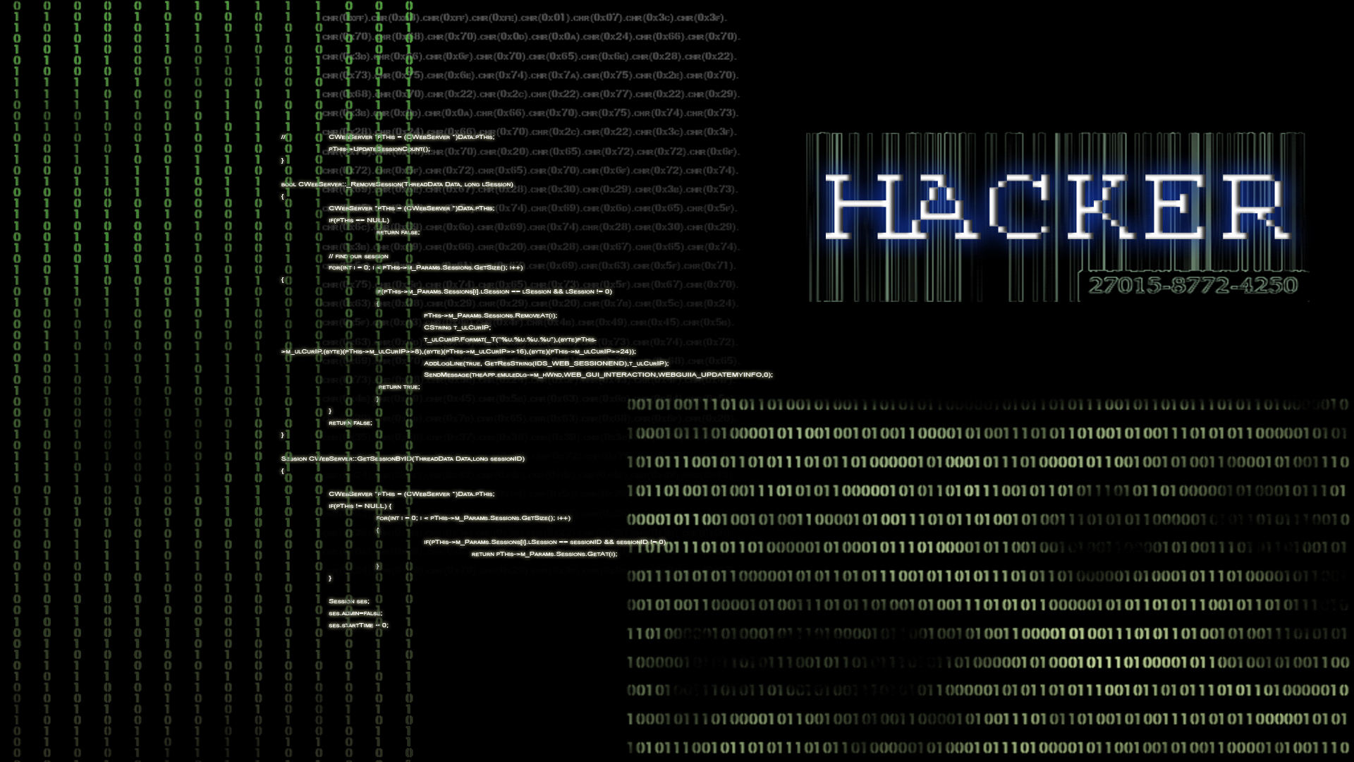 Description: A computer screen with a text that reads hacker on it and a dark background with green and blue numbers.