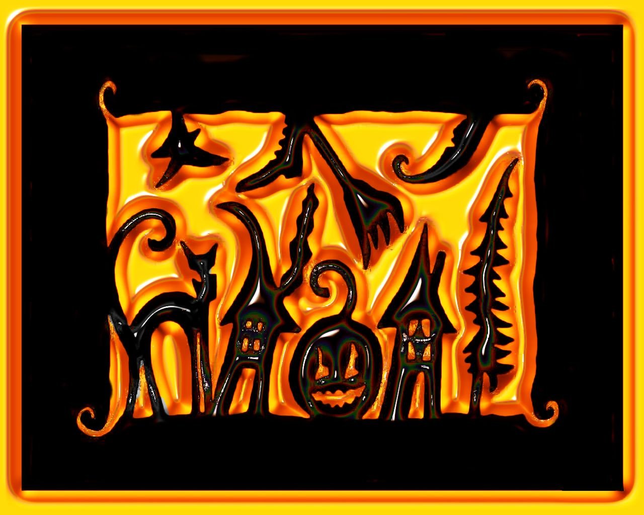 Description: A black and yellow picture of a halloween scene with a pumpkin and a ghost face on it's face.