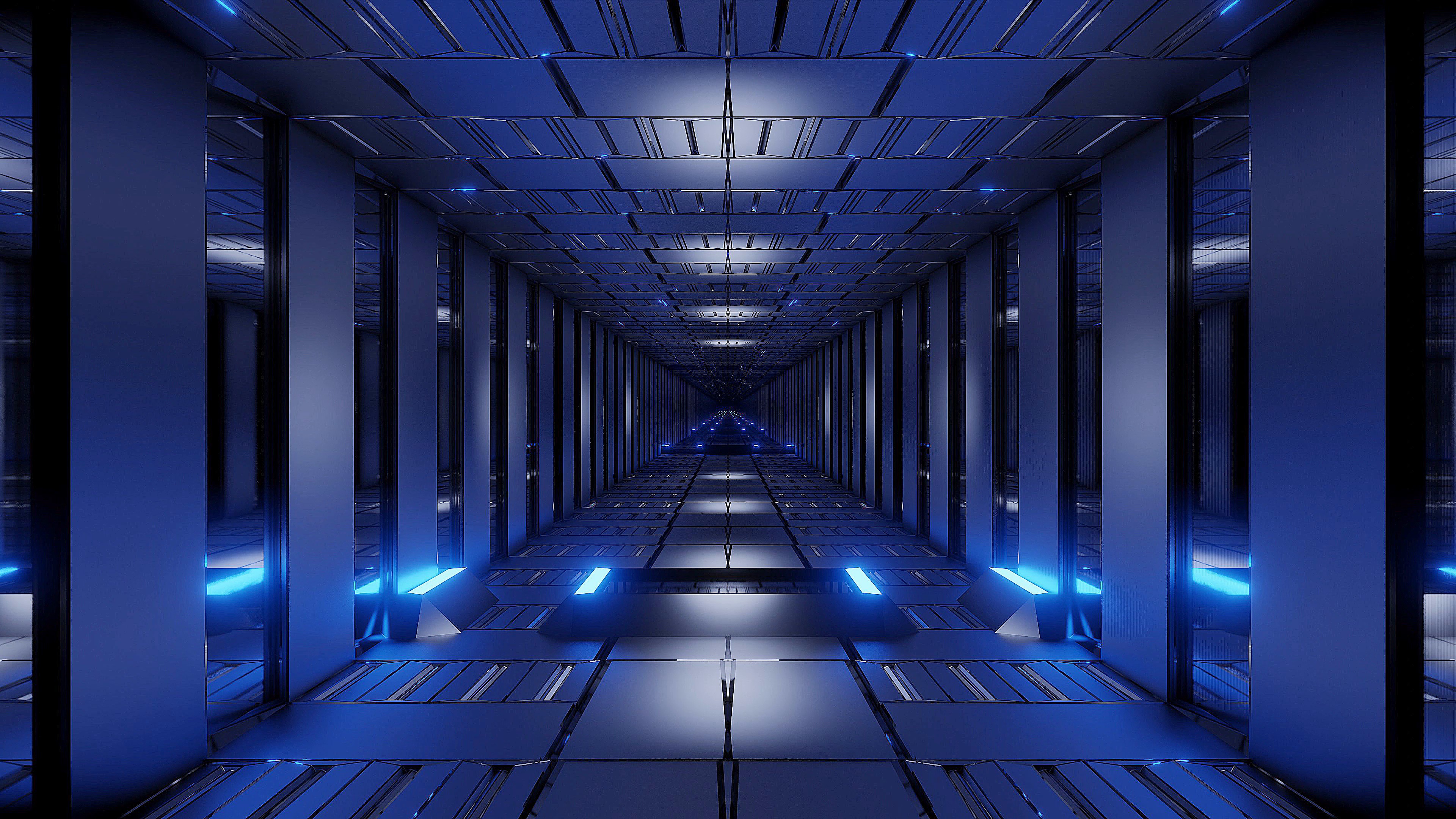 Description: A long hallway with rows of blue lights and a long corridor between them is lit up by blue lights.